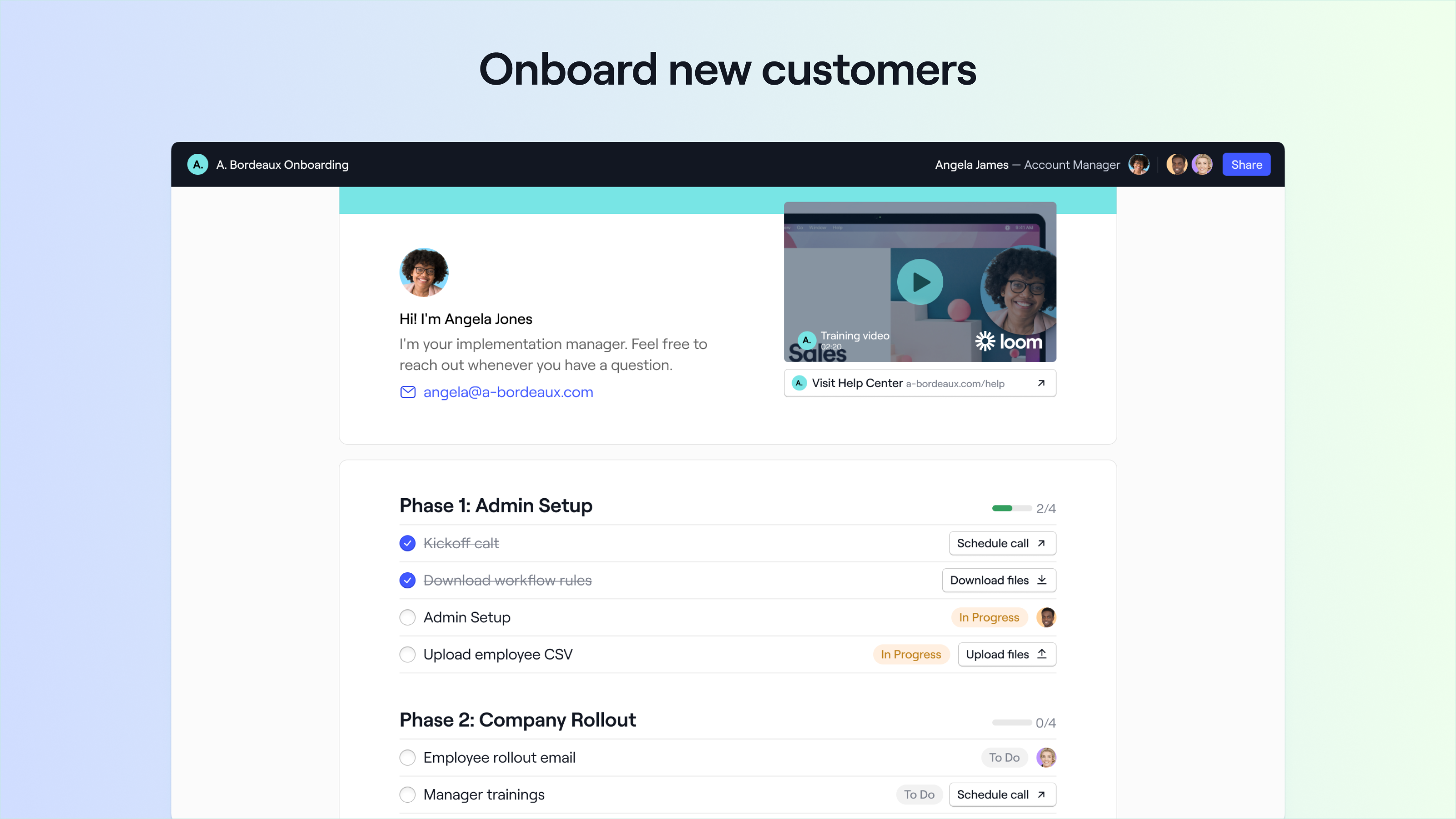 Create project plans and share training resources to onboard new customers. Track progress along the way with Dock's analytics.