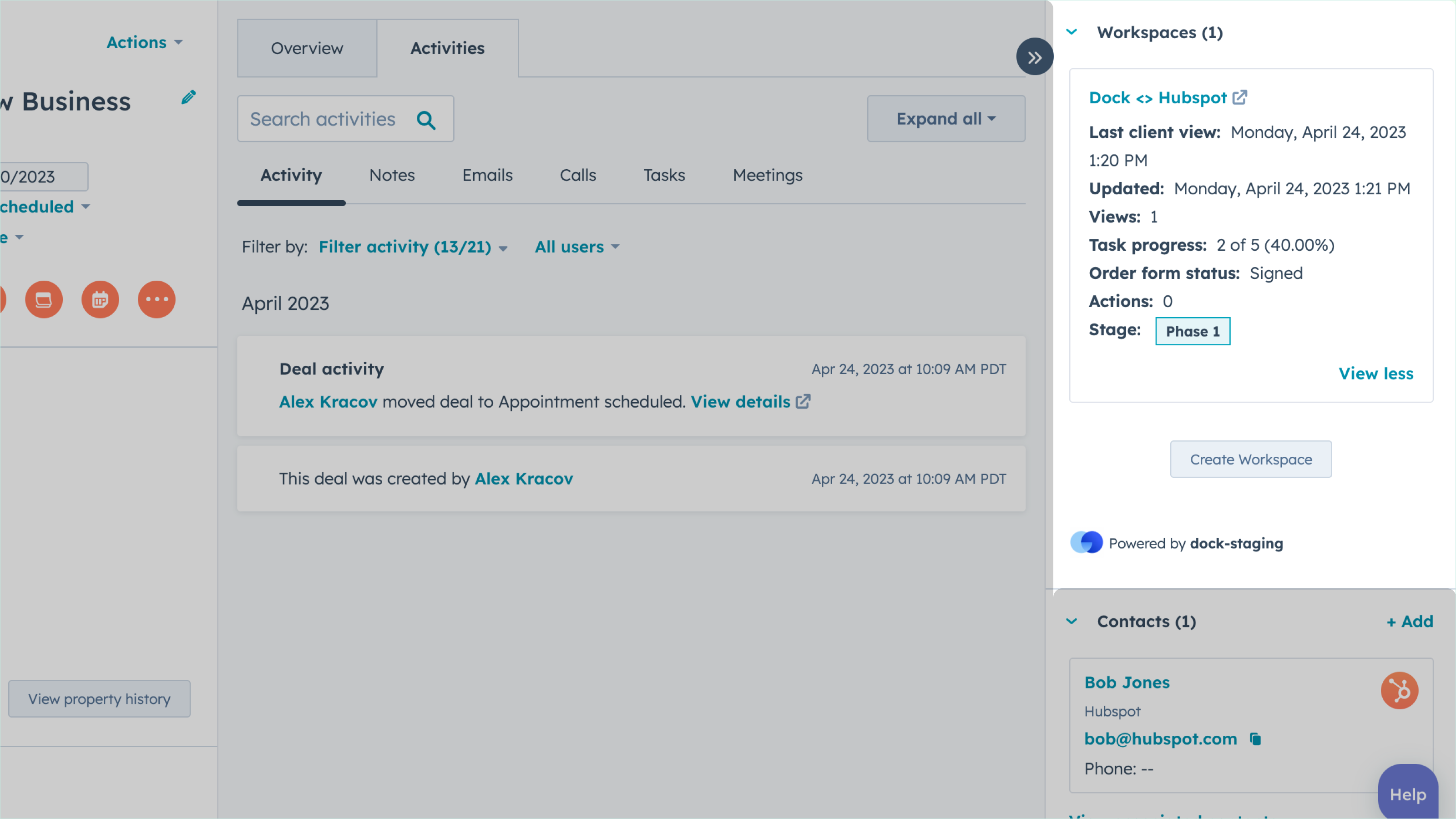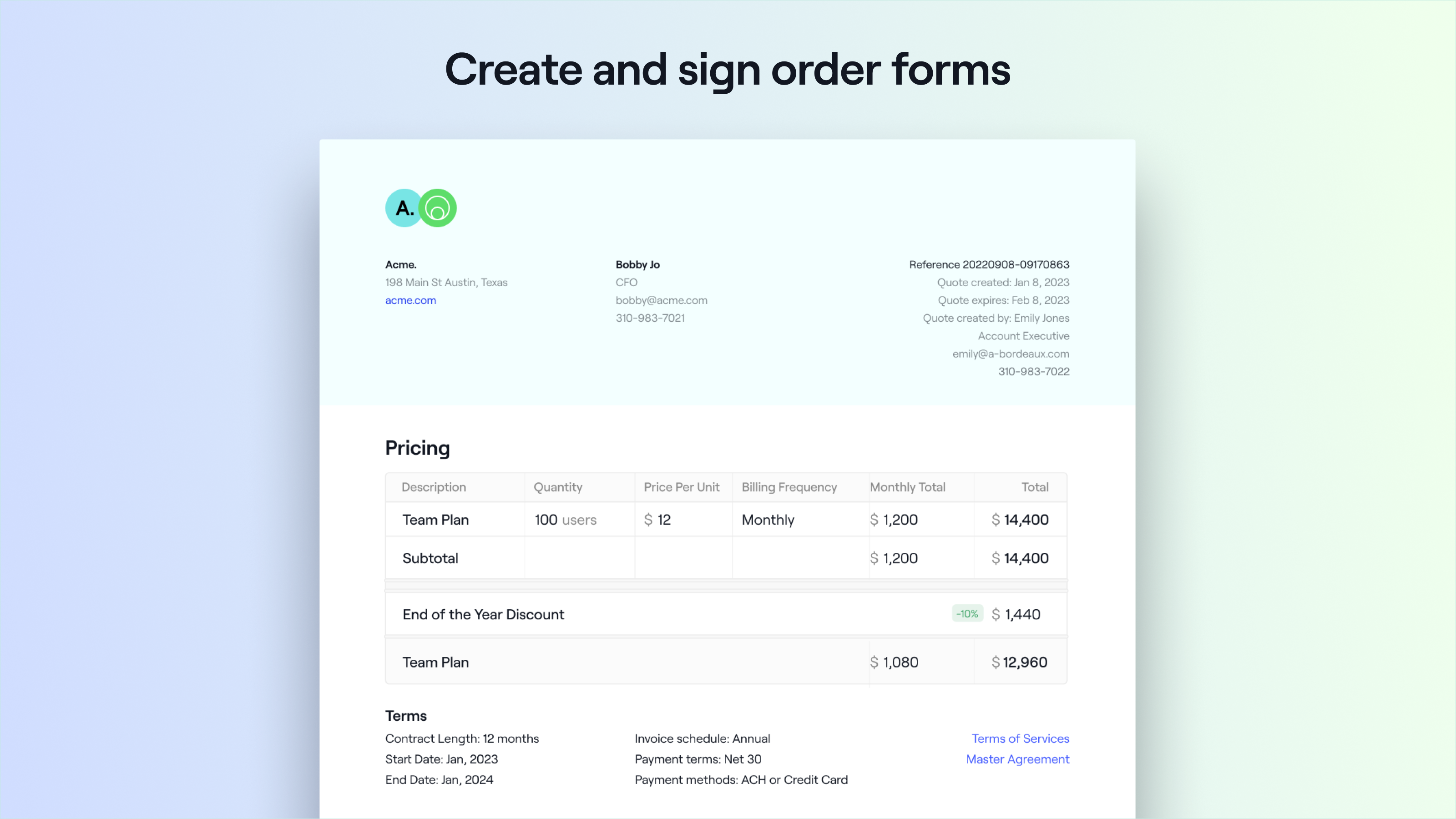 Generate order forms from a product library and sign within Dock. Order Forms sync back to HubSpot.