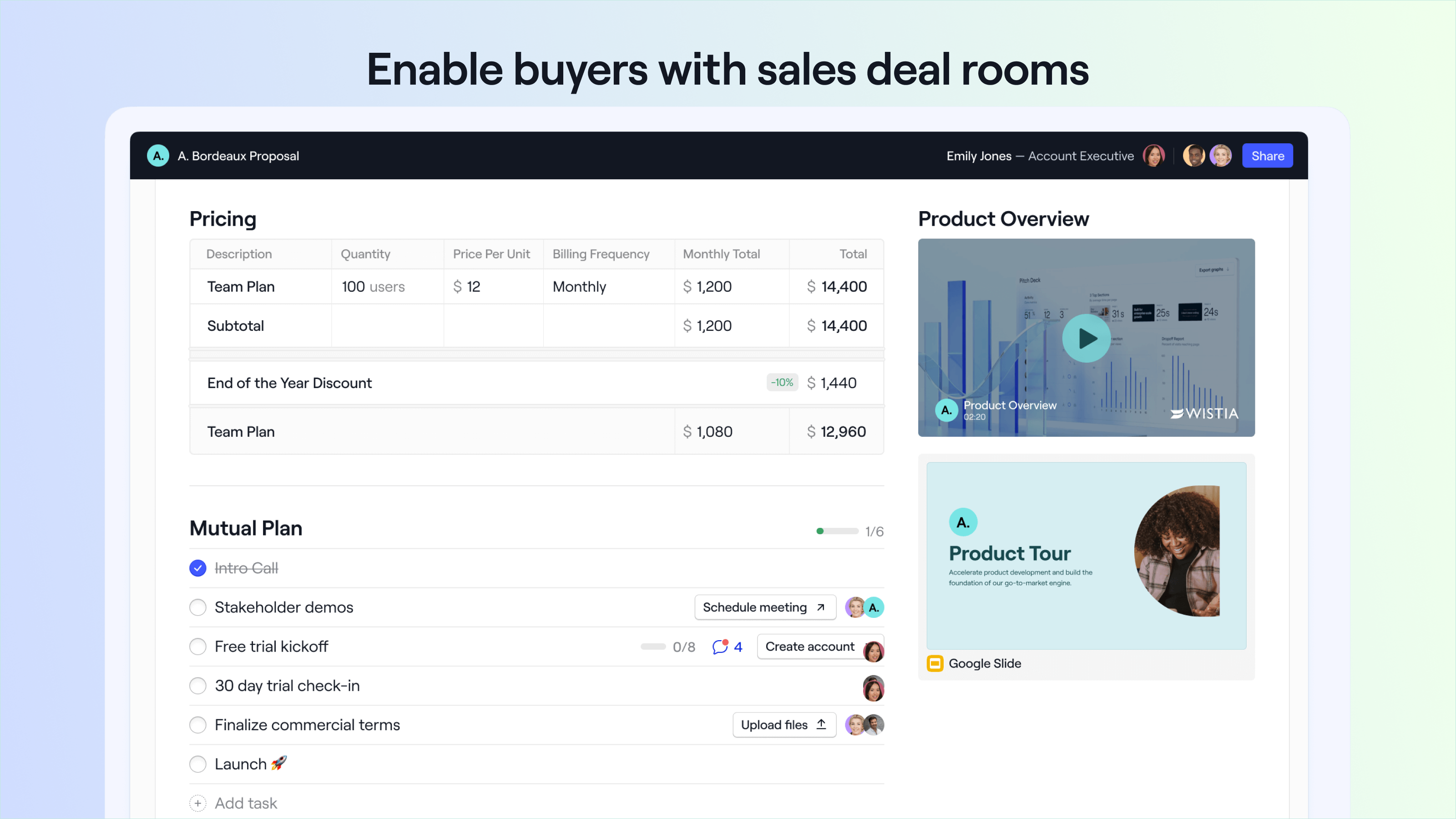 Organize all of your content from demo videos to pitch decks to pricing in a collaborative workspace for buyers