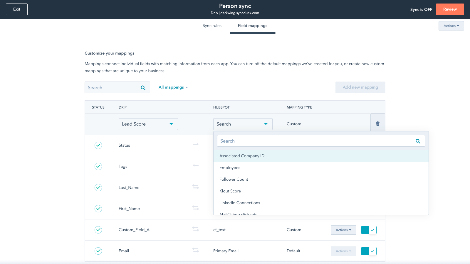Each object has field mappings that connect matching information from each app. Since Drip offers full flexiblity on its field mappings, we cannot offer default mappings like for other Data sync apps. To create your own field mappings, custom field mappings are available with Data Hub Starter and up.