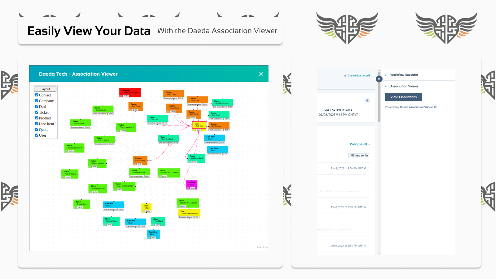 Using the new HubSpot App Cards - you can add the Association Viewer directly to your CRM UI. For a fast and practical experience.