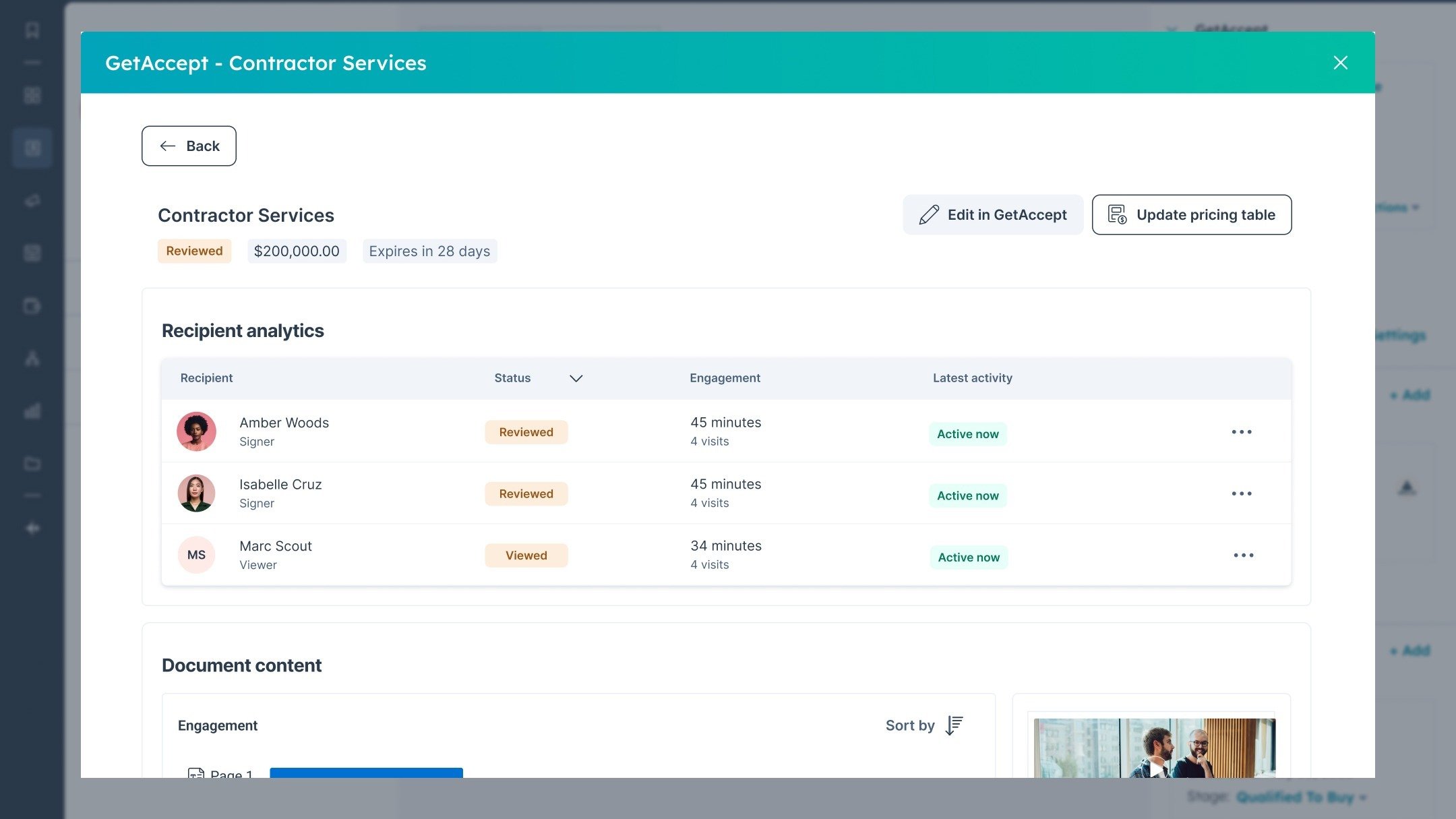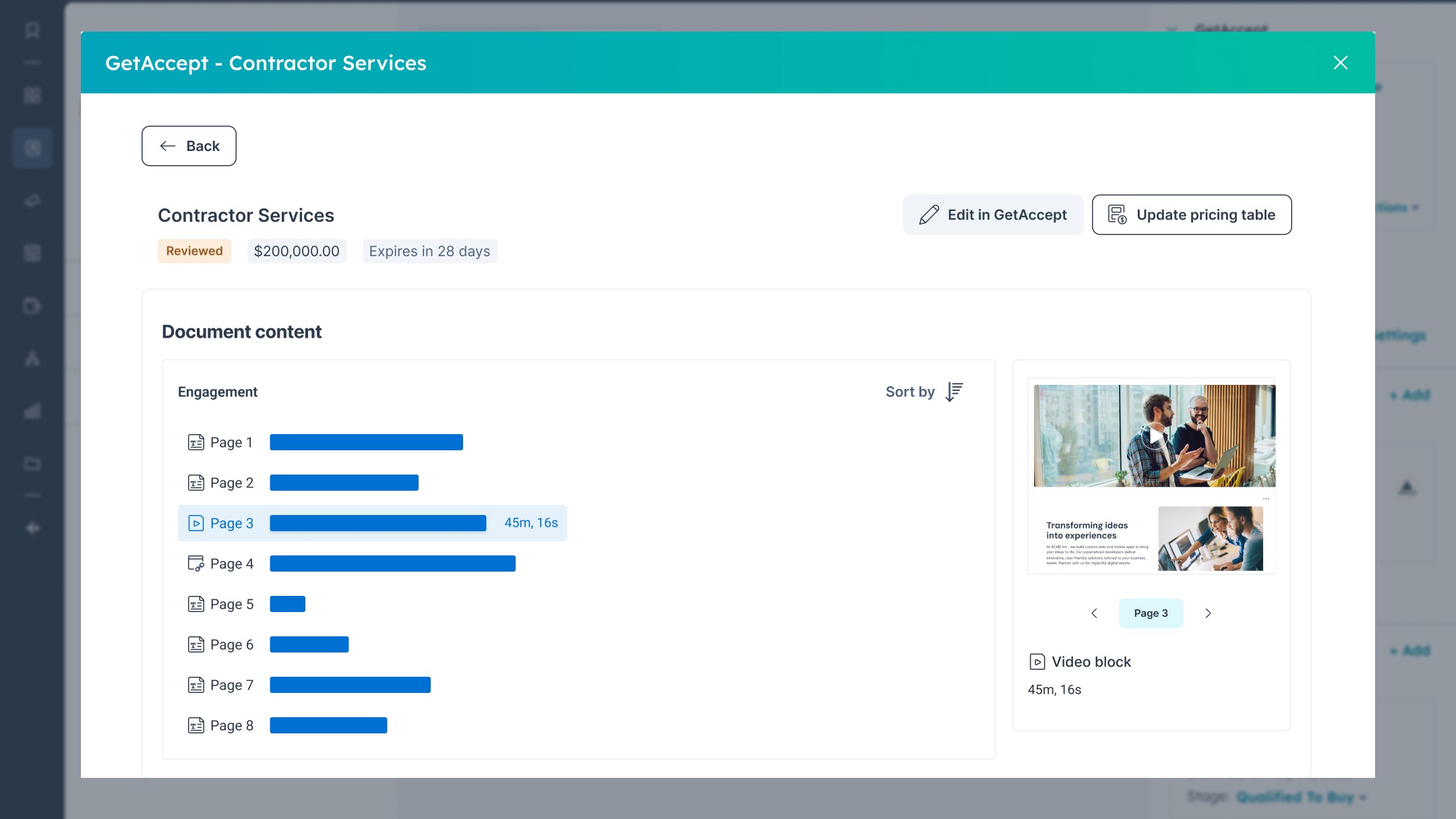 GetAccept enables sales teams to create and manage trackable proposals, quotes and digital sales rooms natively in HubSpot via CRM cards on Deals, Contacts, and Companies. View and track buyer engagement and deal insights (views, time spent, interactions, etc) on your sendouts from your HubSpot timelines in real time.