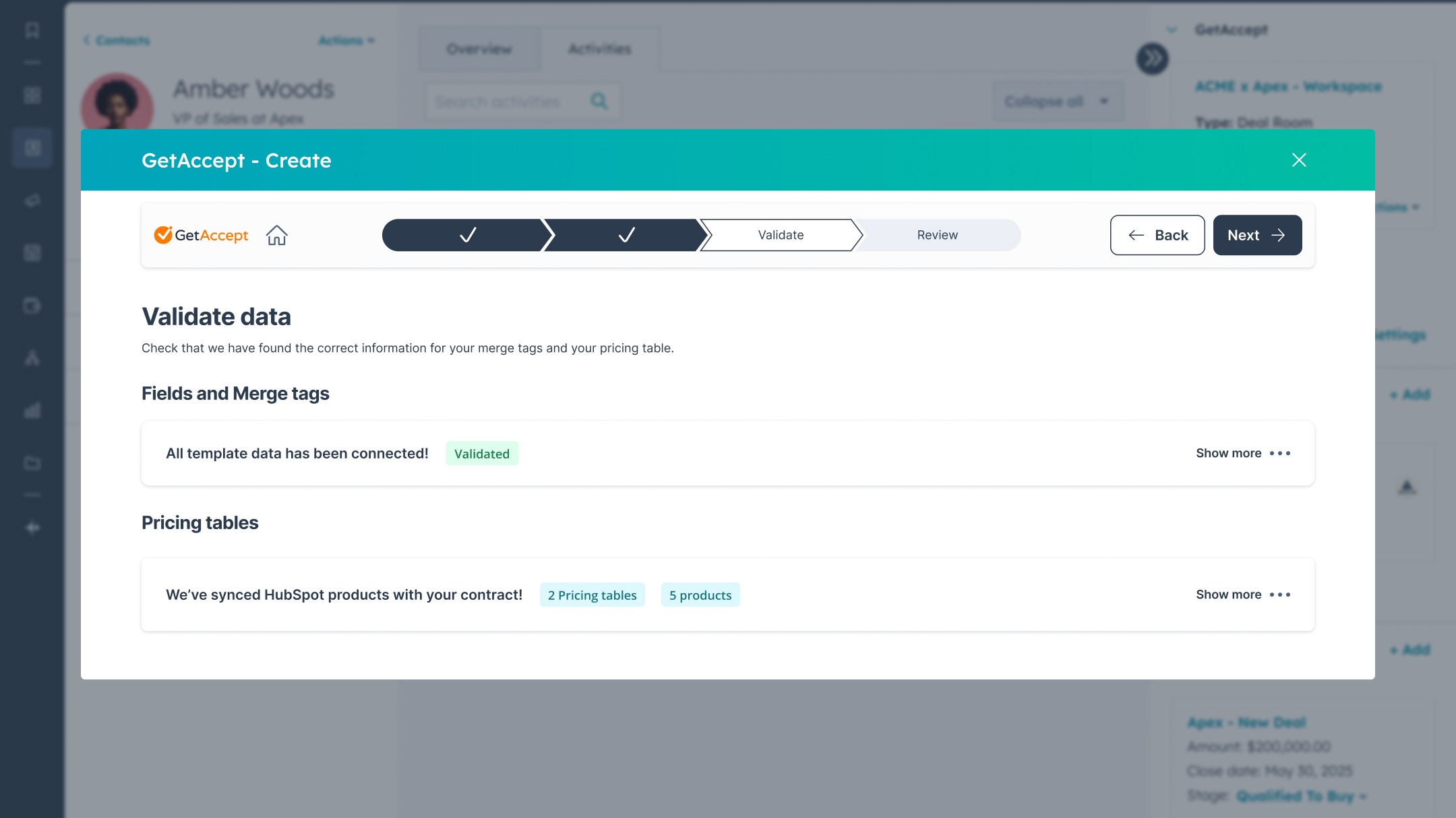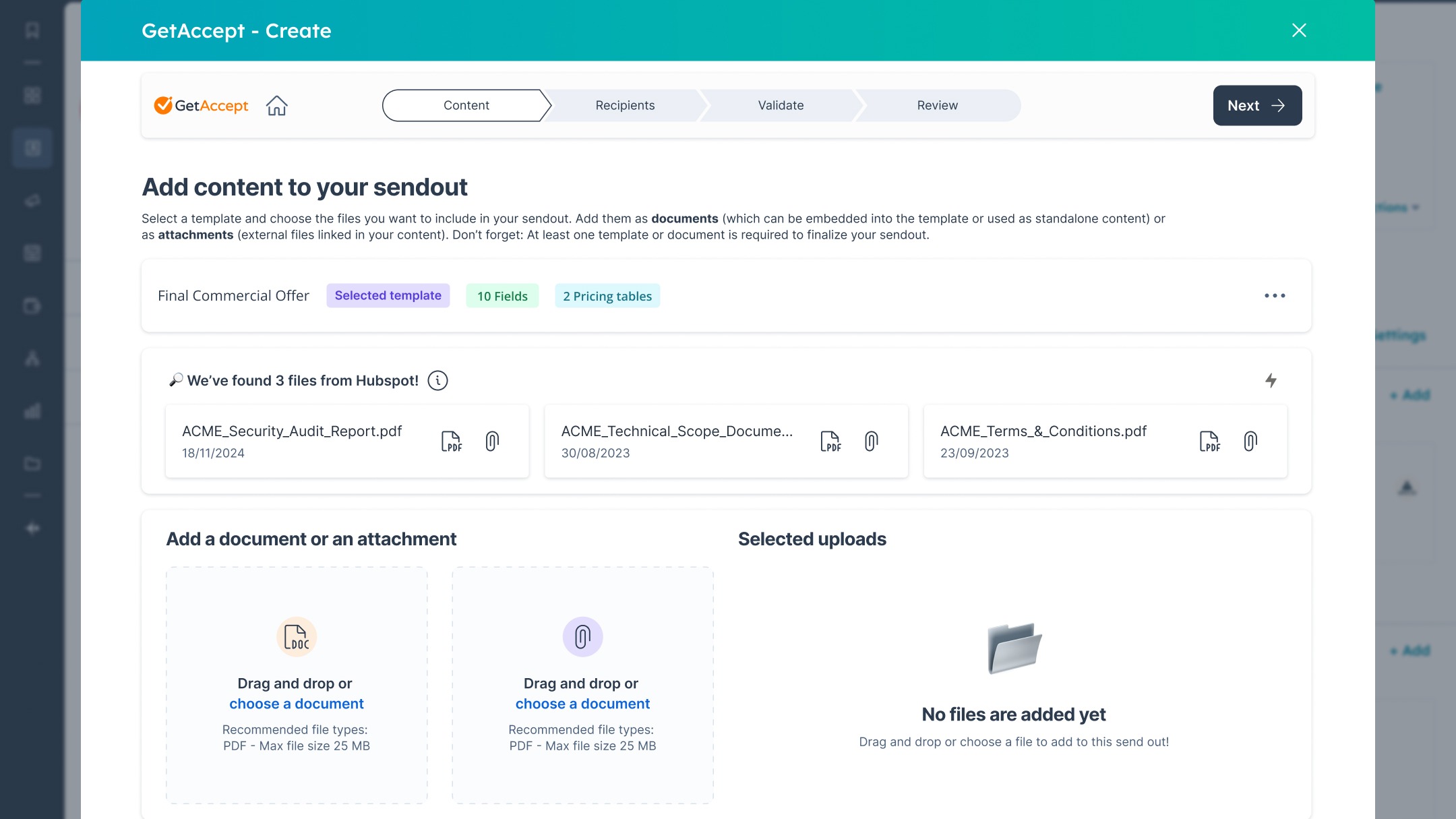 Capture recipient-filled data in a GetAccept proposal, contract or Digital Sales Room and automatically update the corresponding HubSpot fields. Automatically update HubSpot Deal product data when buyers select optional or variable products on proposals and quotes. The integration supports fetching of data in HubSpot custom objects.
