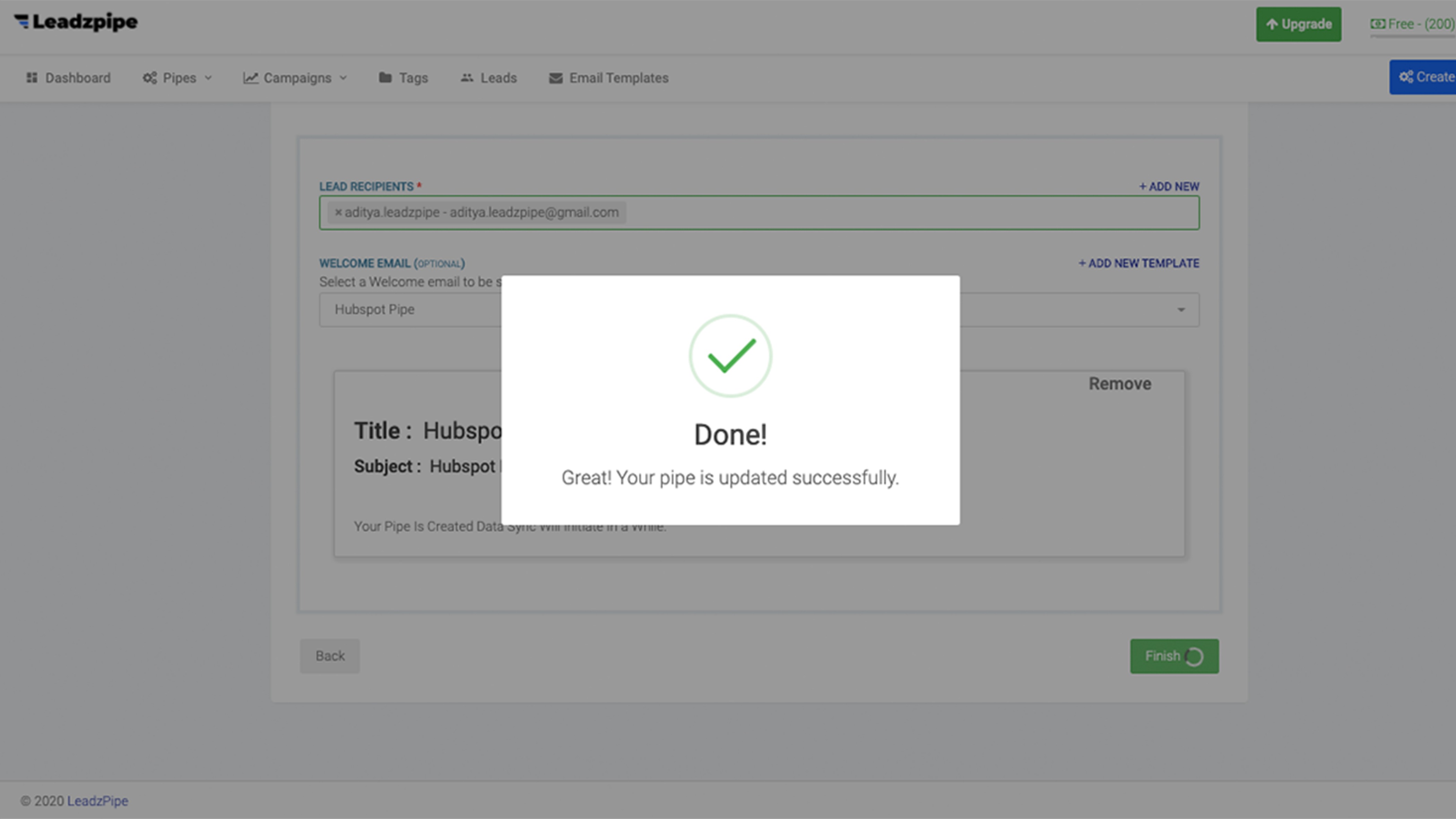 Add lead recipient and add an email template click finish. Awesome your pipe created and syncing begins.