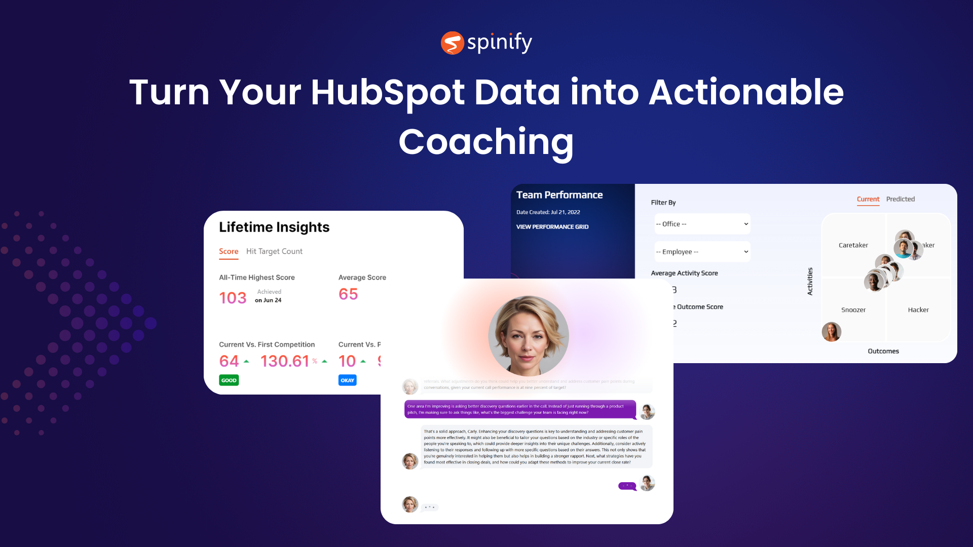 Supercharge your team’s performance with Spinify AI. By seamlessly integrating with HubSpot, Spinify AI analyzes your sales data to uncover performance gaps, highlight coaching opportunities, and deliver personalized guidance and insights for every rep—so they can hit their targets faster.