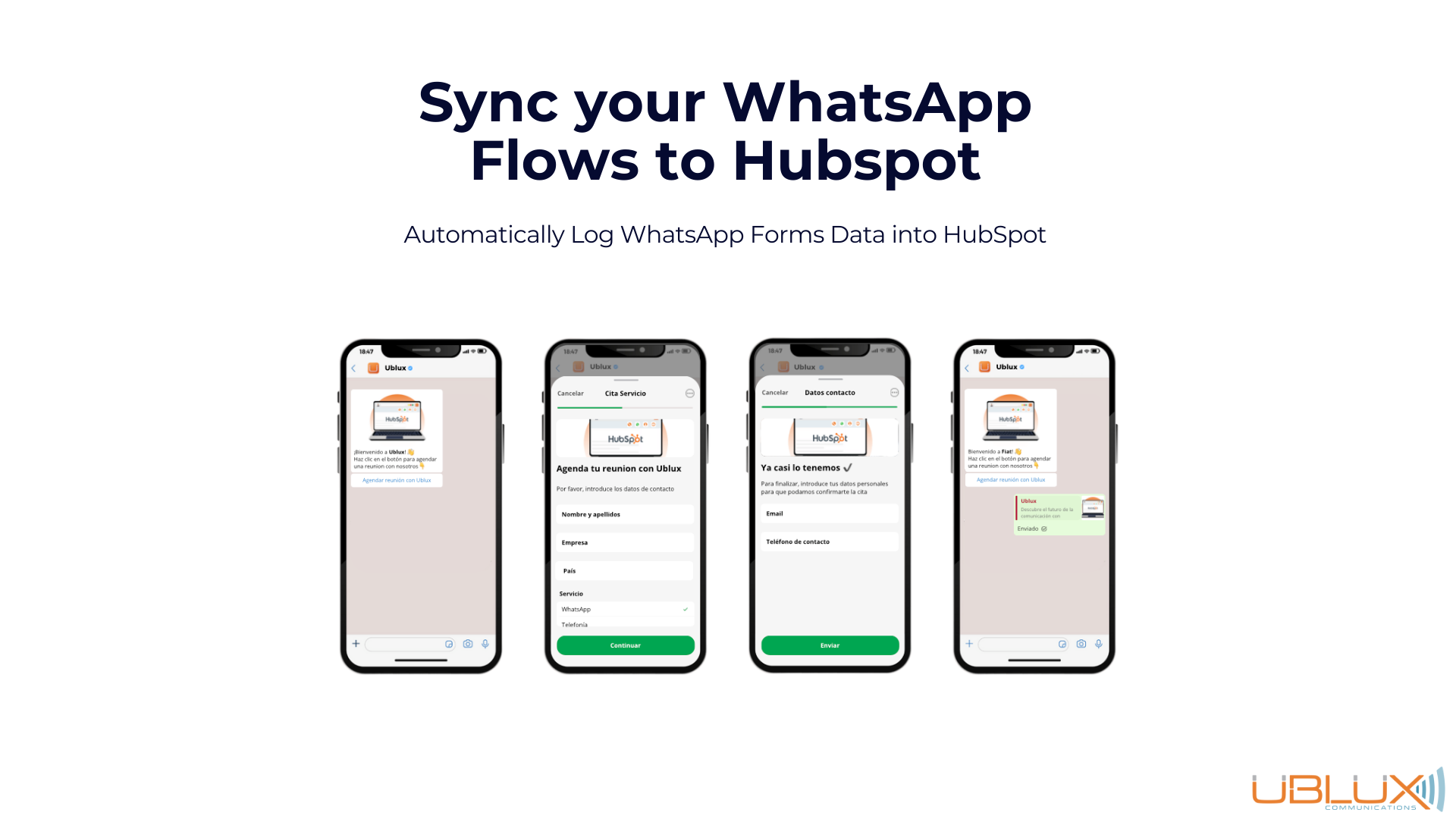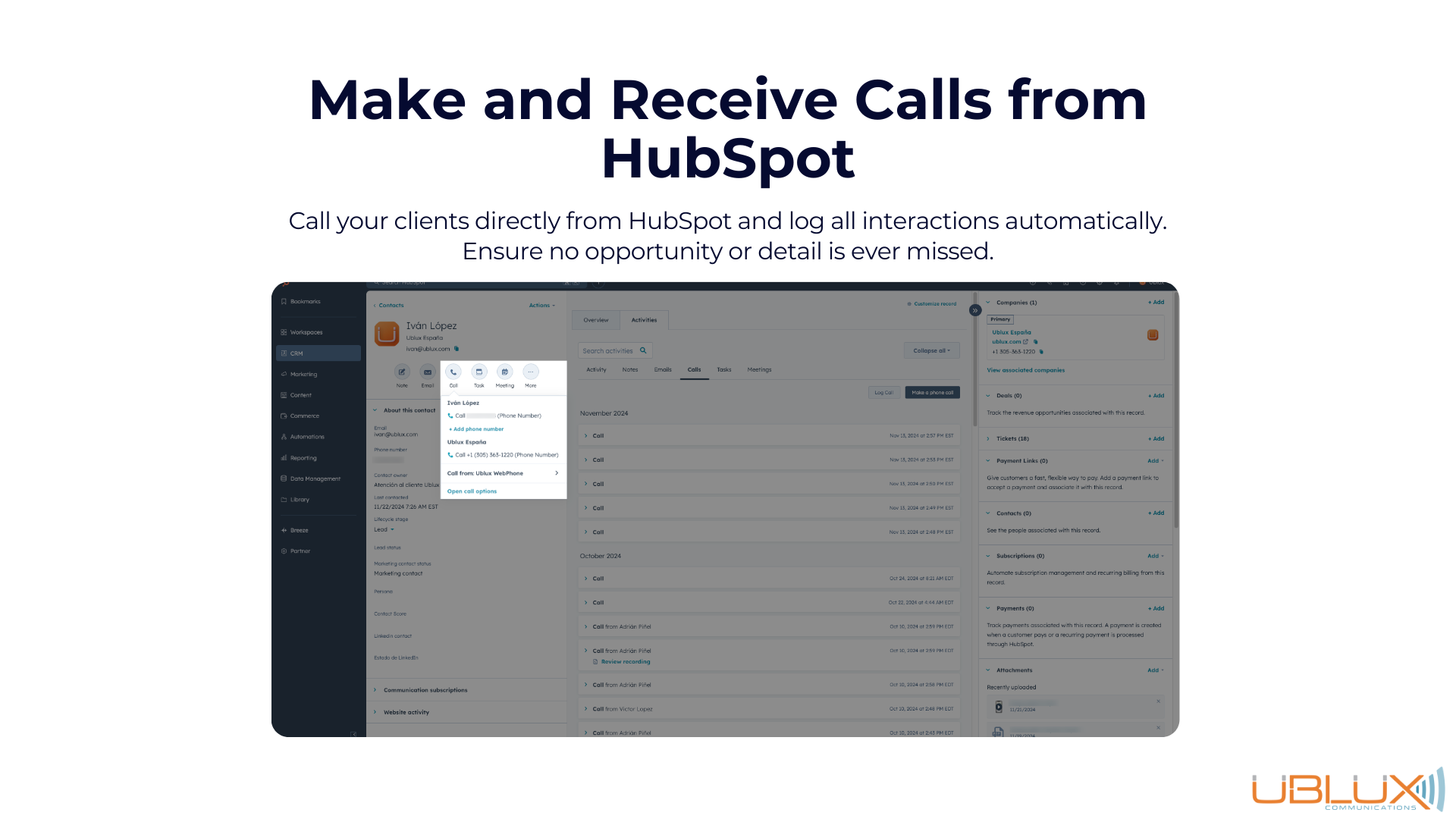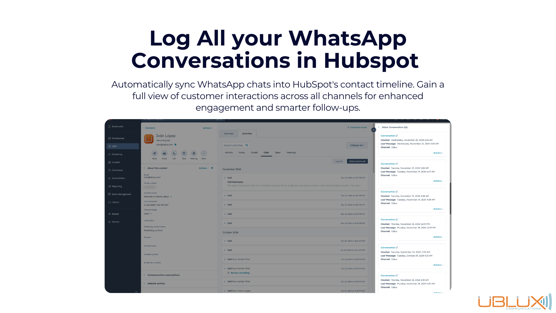 Streamline your communications with Ublux, the ultimate solution for integrating Phone calls and WhatsApp into HubSpot.