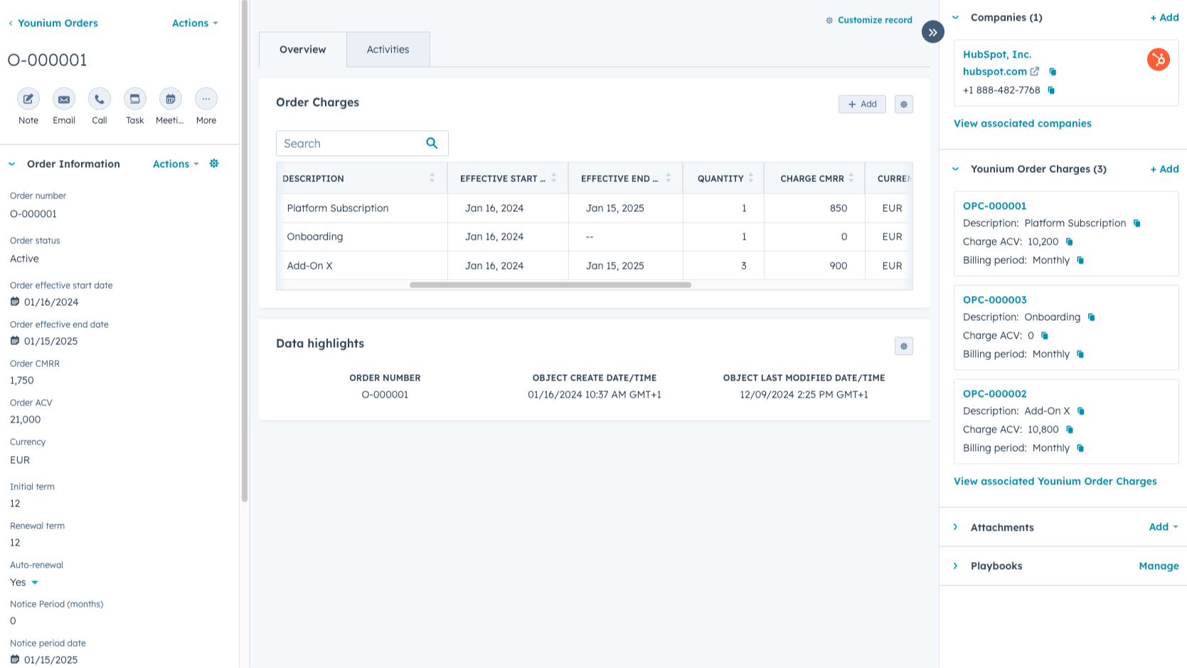 Insights Dashboard: View Younium account information, orders, and invoices directly within HubSpot under the "Insights" card in the company profile.