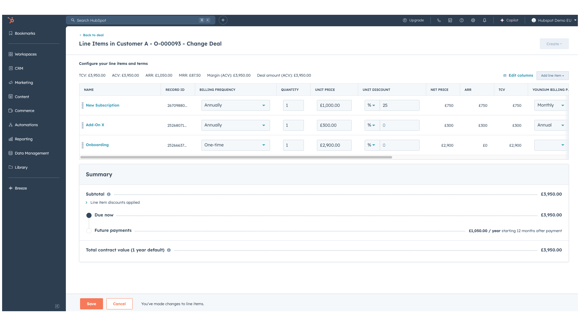 Push closed deals from HubSpot to Younium with one click. Supports flat and quantity-based pricing models, ensuring flexibility in deal structuring.