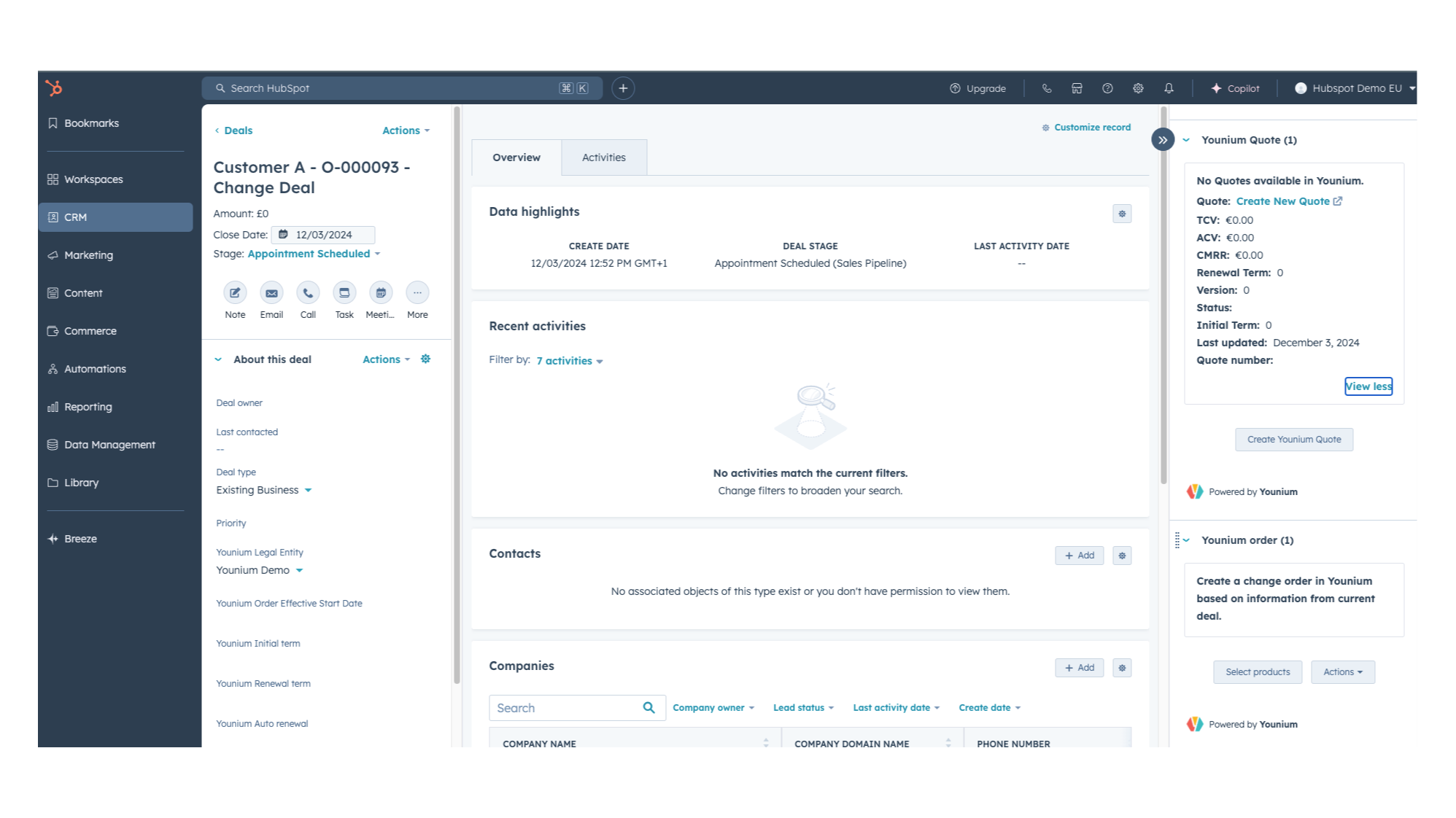 Quote Creation: Generate Younium quotes directly from HubSpot's deal object, including auto-import of company data.