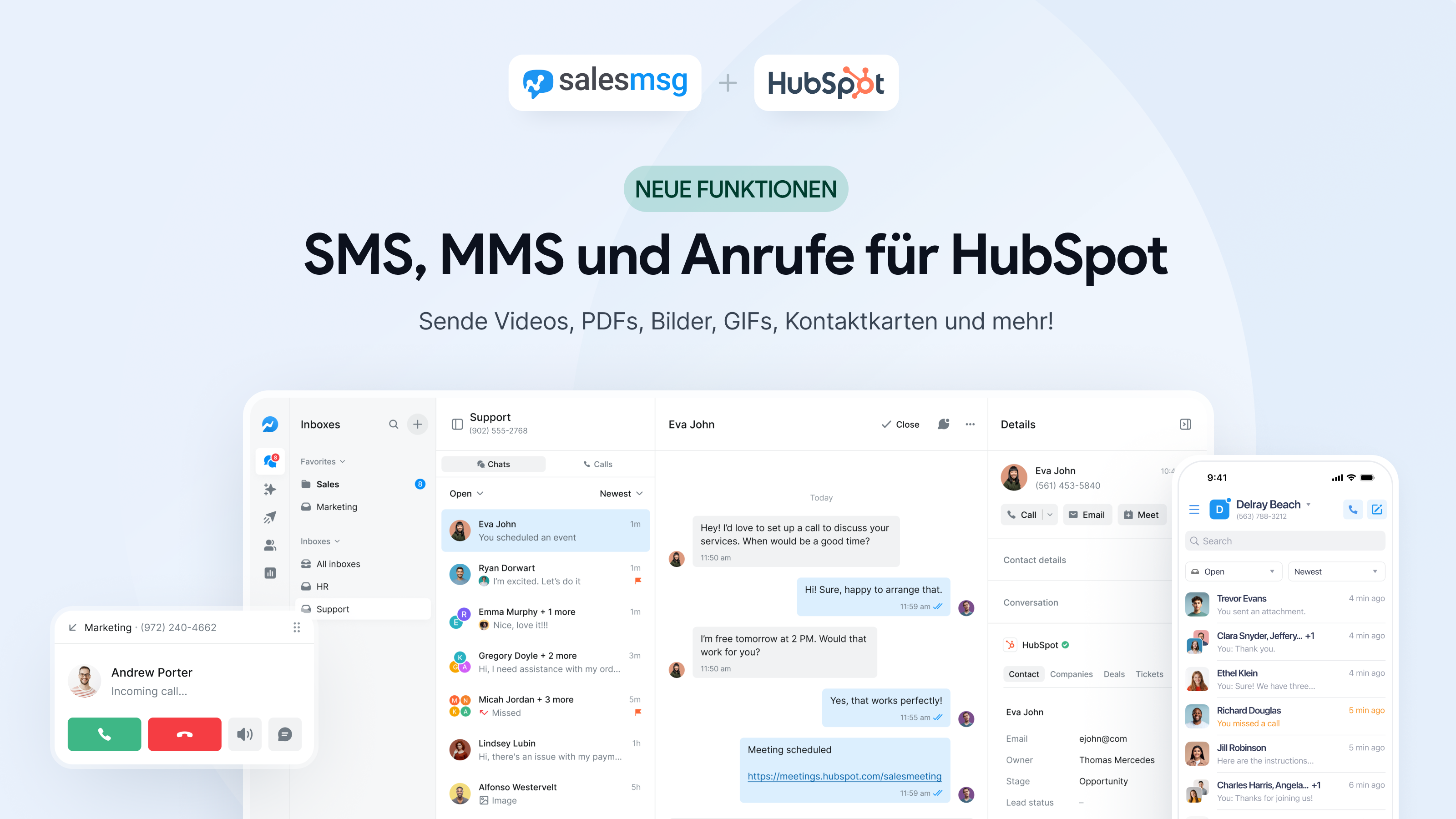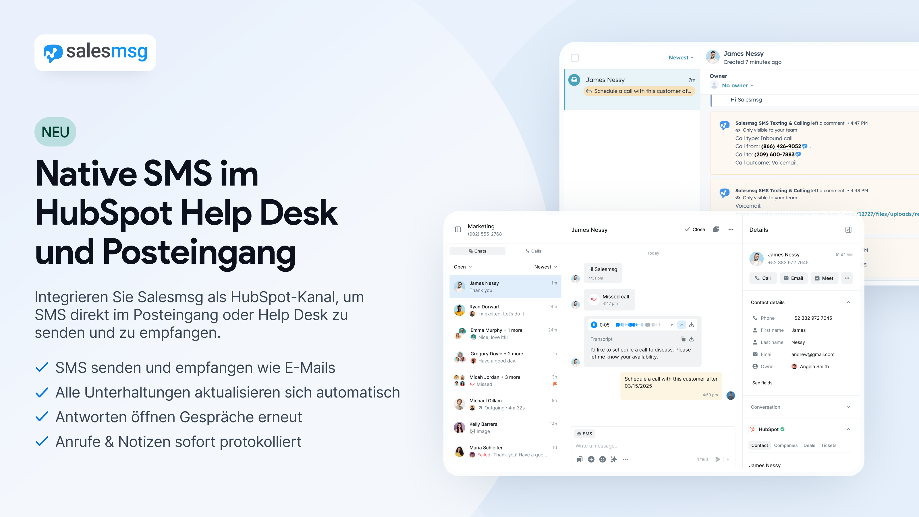 Integrieren Sie Salesmsg als Kanal in HubSpot, um SMS genauso einfach wie E-Mails direkt im Posteingang oder Help Desk zu senden und zu empfangen. Alle Unterhaltungen aktualisieren sich automatisch, Antworten öffnen bestehende Gespräche erneut, und Anrufe sowie Notizen werden sofort protokolliert – für eine nahtlose, zentrale Kommunikation mit Ihren Kontakten.