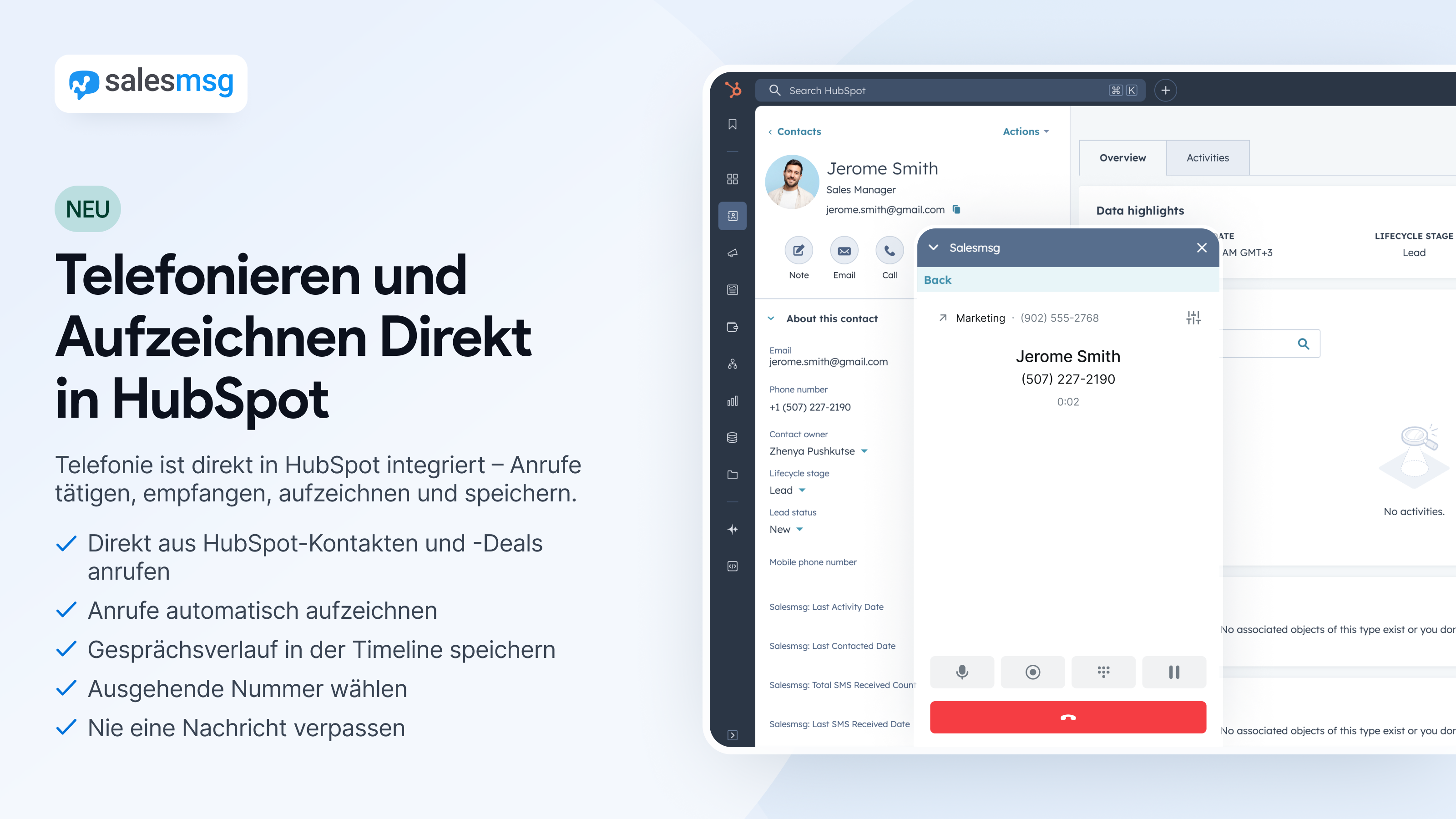 Die in Salesmsg integrierte Anrufplattform ermöglicht es Ihnen, Ihre Kontakte direkt von Ihrem HubSpot-Konto aus anzurufen und alles direkt in der Timeline zu dokumentieren. Texting und Anrufe in 1 Plattform integriert.