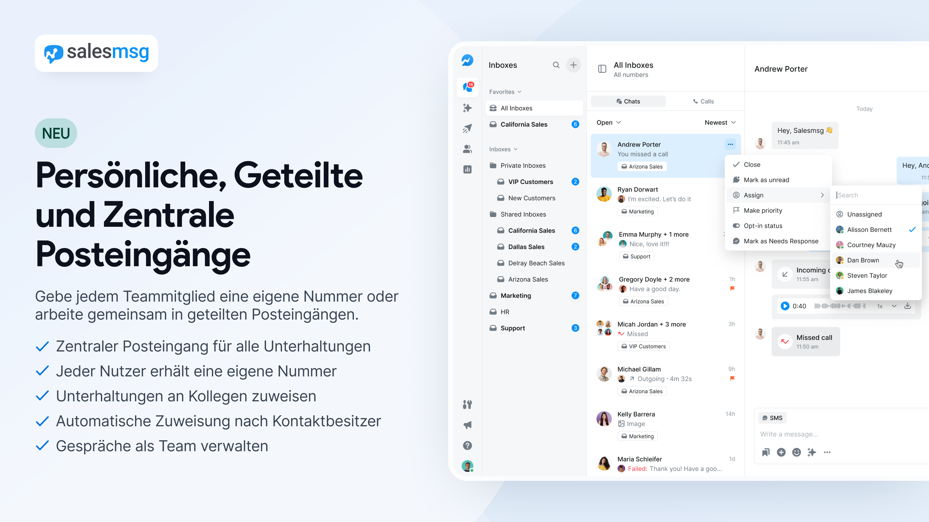 Verwalte Kundenkommunikation effizient im Team: Gib jedem Teammitglied eine eigene Nummer oder arbeite gemeinsam in geteilten Posteingängen. Alle Unterhaltungen erscheinen in einem zentralen Posteingang, sodass nichts verloren geht. Weisen Sie Gespräche manuell Kollegen zu oder nutzen Sie die automatische Zuweisung basierend auf dem Kontaktbesitzer.