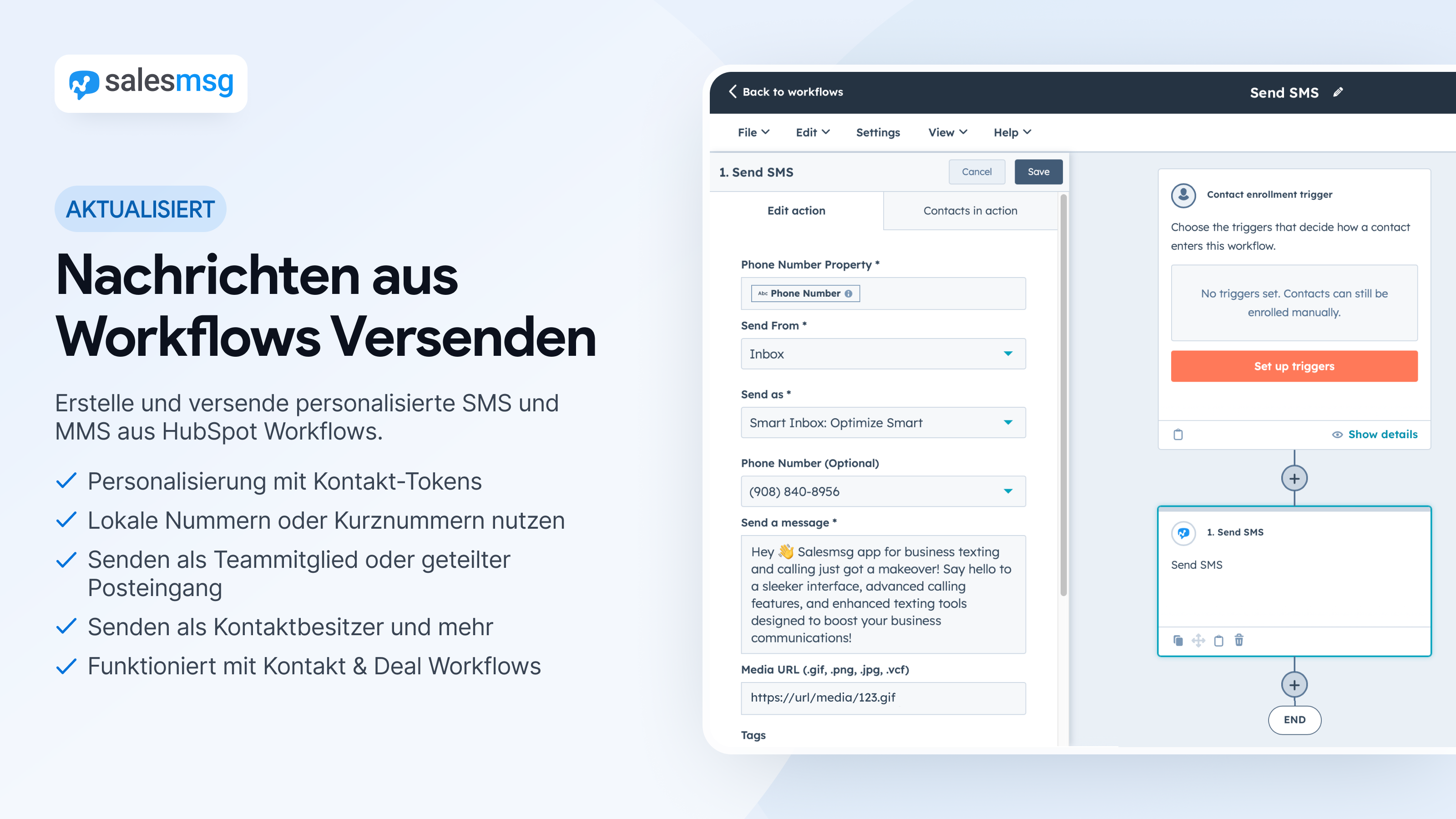 Fügen Sie ganz einfach personalisierte Texte in JEDEN HubSpot-Workflow (Kontakte, Tickets oder Geschäfte) ein oder lösen Sie Workflows mit Salesmsg-Tags aus. Durch das Hinzufügen einer einzigen Textnachricht können Sie Ihre Ergebnisse für jeden bestehenden Workflow in Ihrem Unternehmen steigern.