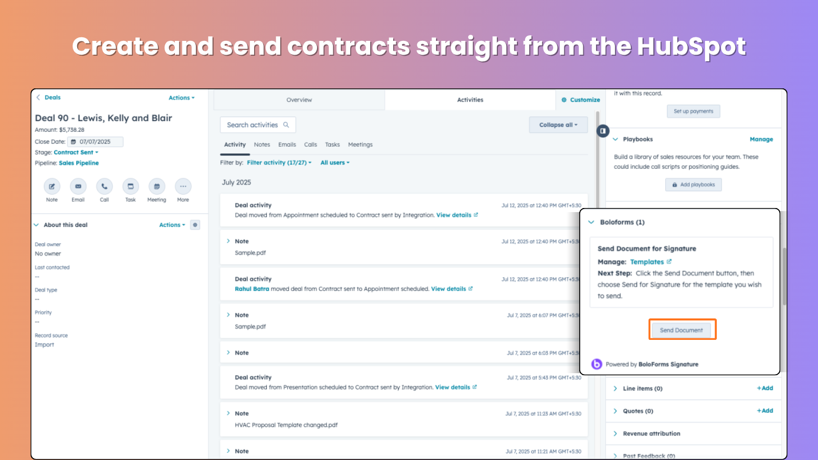 With BoloSign, you can generate a contract right from your HubSpot deal and send it out for signature instantly. Everything stays in HubSpot—fast, accurate, and hassle-free for your sales team.