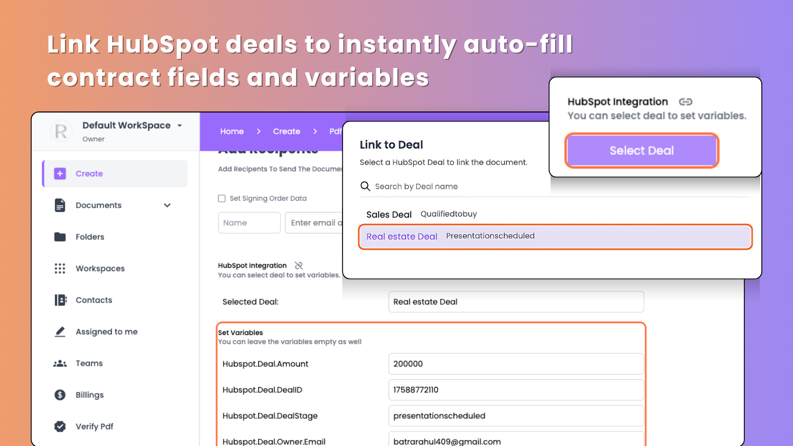 Stop wasting hours creating the same contracts again and again. Select a HubSpot deal or contact, and BoloSign instantly pre-fills your templates with variables like deal amount, stage, owner, company details, and emails. You get error-free, ready-to-send documents in seconds.