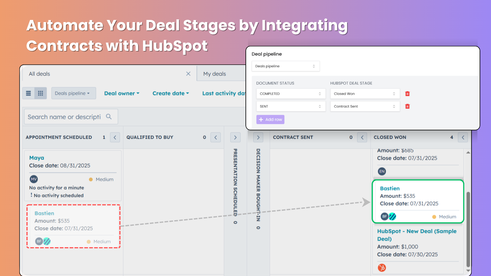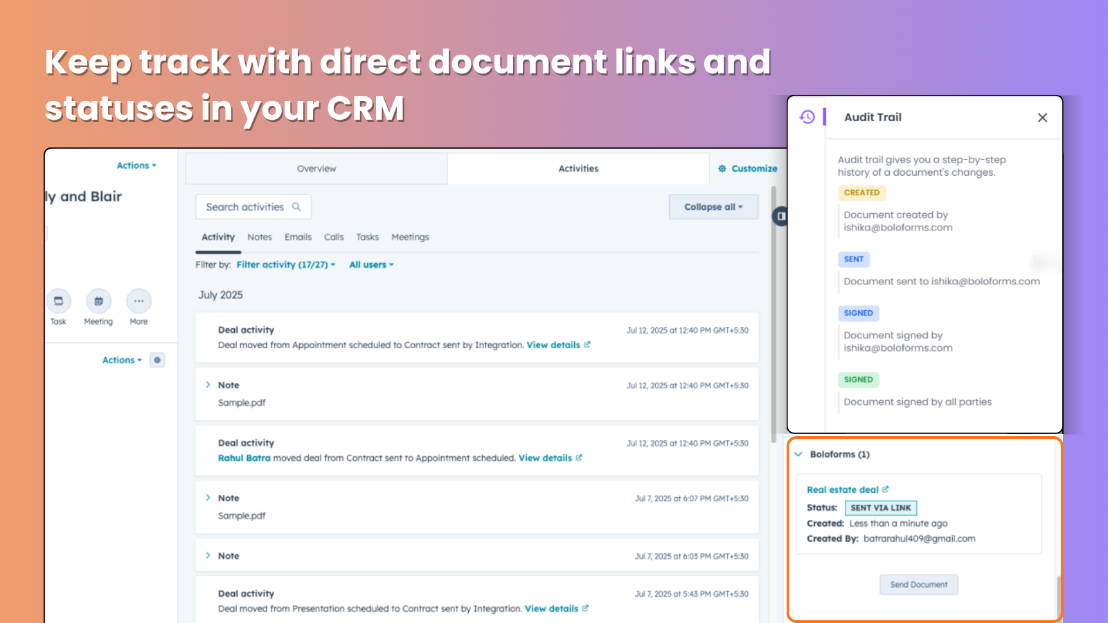 Every signed document updates your HubSpot pipeline in real time. Proposals viewed? Deal stage updated. Contract signed? Pipeline advanced. Your reps spend more time closing and less time cleaning up data. From bulk send to branded templates and secure audit logs, you have it all with BoloSign.