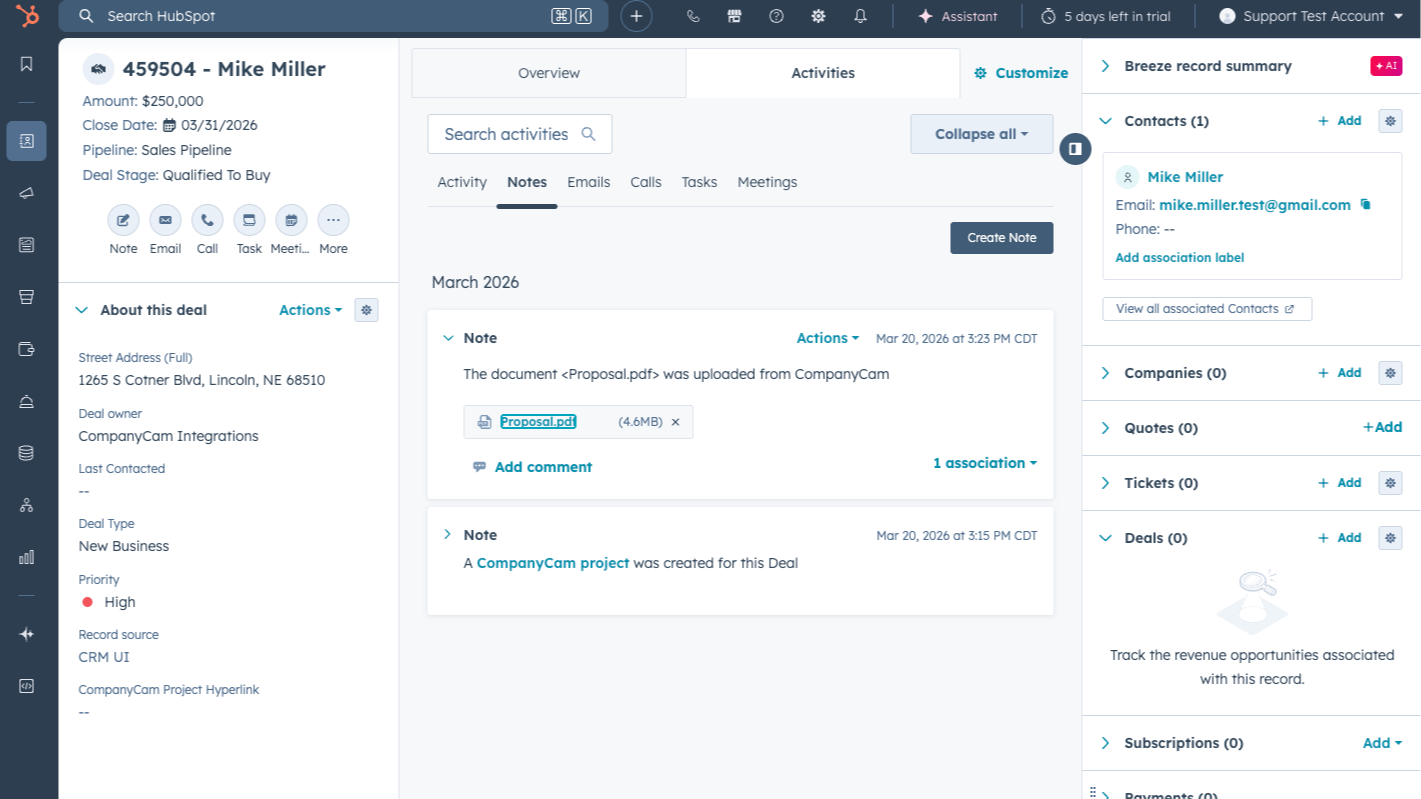 Wenn ein HubSpot-Geschäft oder -Kontakt hinzugefügt wird, erstellt die Integration automatisch ein CompanyCam-Projekt und fügt einen Deep Link zum HubSpot-Datensatz hinzu. Wenn in CompanyCam Dateien hinzugefügt werden, werden diese automatisch mit dem Abschnitt für Anhänge des Geschäfts in HubSpot synchronisiert.