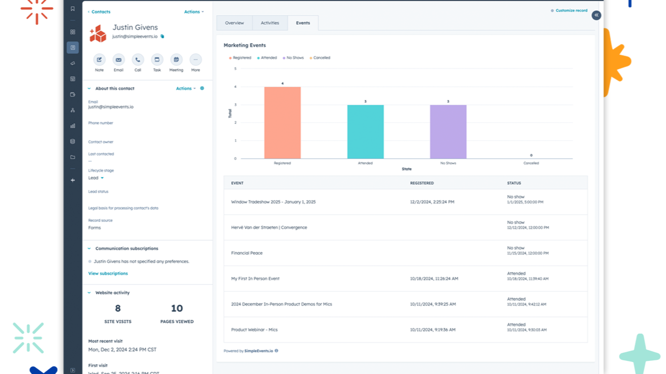 Get a contact breakdown of all the events they have ever registered for, attended, and more.