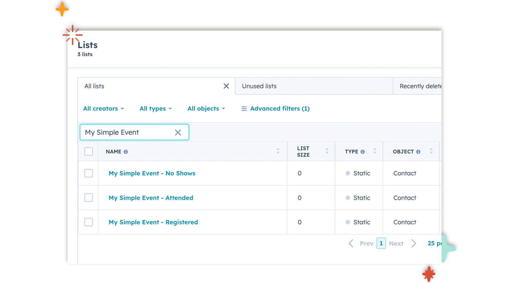 Keep yourself organized with event-specific lists. For our Pro accounts (and higher), three lists are created for each event so you have a simple understand of who's registered, attended and did not show up.