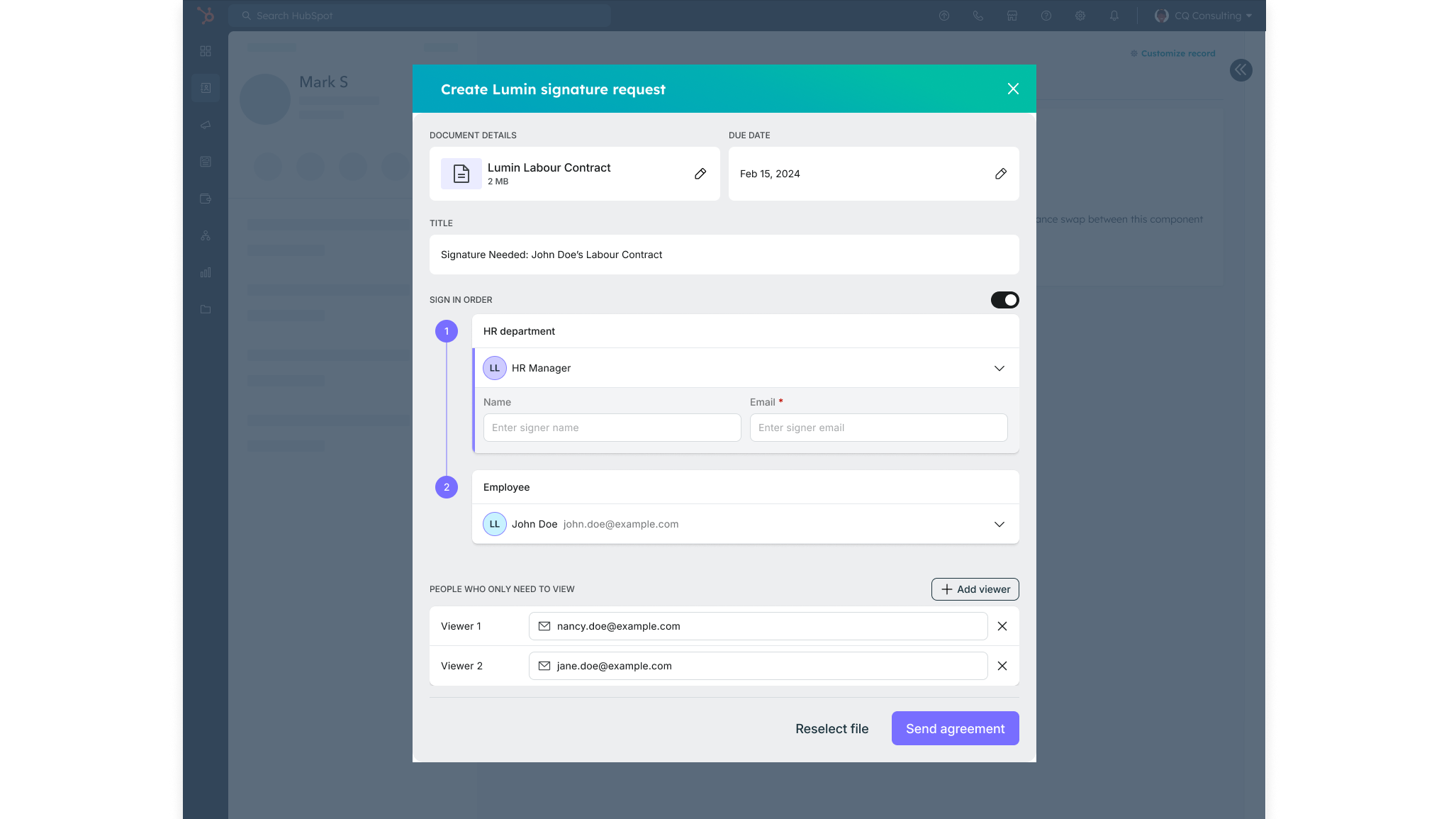 Erstellen und versenden Sie Verträge zur elektronischen Unterschrift direkt aus jedem Geschäfts-, Kontakt- oder Unternehmensdatensatz in HubSpot. Wählen Sie eine Lumin-Vorlage, füllen Sie Felder automatisch mit HubSpot-Daten aus, legen Sie Empfänger, Unterschriftsreihenfolge, Fälligkeitstermine usw. fest - alles, ohne HubSpot zu verlassen.