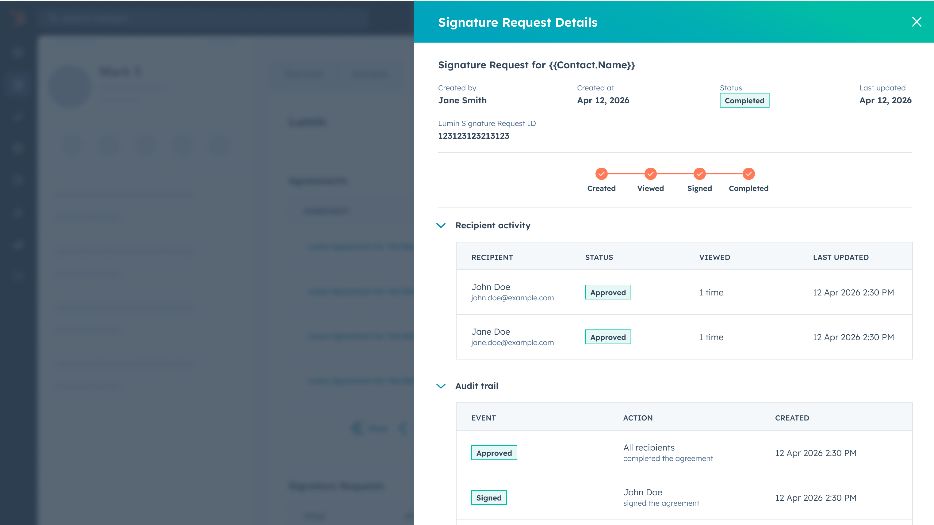 Statusaktualisierungen von Unterschriftsanforderungen (gesendet, angesehen, unterzeichnet, abgelehnt, storniert) werden verfolgt und auf der HubSpot Lumin-App-Karte angezeigt. Signierte Dokumente und Abschlusszertifikate können heruntergeladen und an HubSpot-Datensätze angehängt werden.
