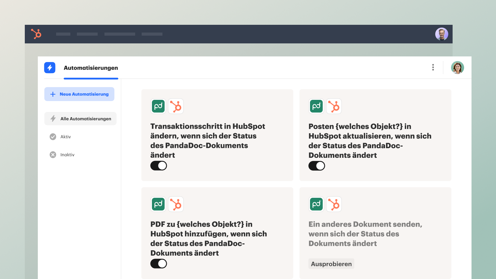 Änderungen, die Sie in HubSpot vornehmen, werden unmittelbar in den entsprechenden PandaDoc-Feldern abgebildet – und umgekehrt. So sind alle Daten immer auf dem neuesten Stand. Und wenn Sie ein Dokument abschicken, erhalten Sie direkt in HubSpot Empfangsbenachrichtigungen und wichtige Leistungskennzahlen.