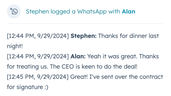 Automatically sync your Whatsapp conversations with your HubSpot contact's activity timeline.