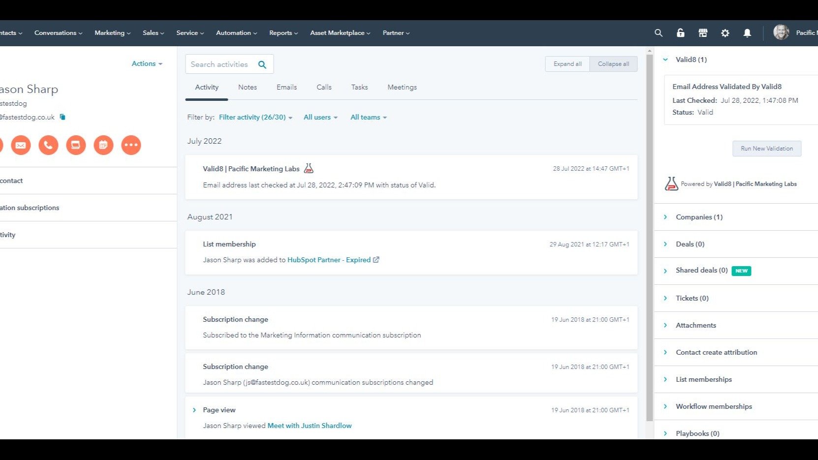 Automatically verify the email address of any new contacts, created manually, via a form submission or when booking a meeting. The results are stored in custom properties and logged to the contact's activity timeline for instant access. Catch bogus form fills and typos before they impact your Marketing Contact numbers and sender reputation.