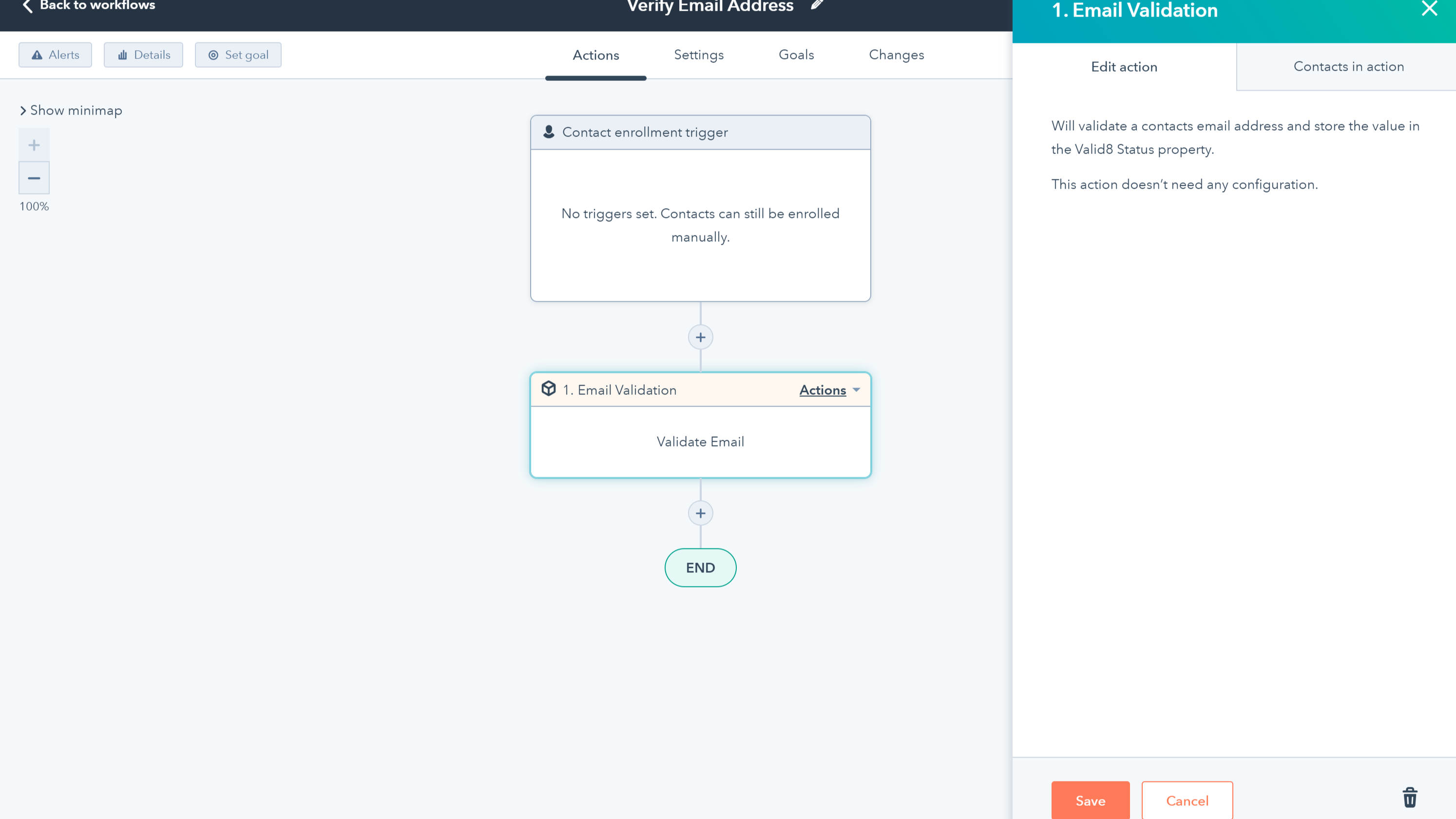 Valid8 email validation can be easily added to your HubSpot workflows. No need to configure anything, just drop Valid8 into your workflow then use the result (stored to Valid8's custom Contact properties) to determine next actions.