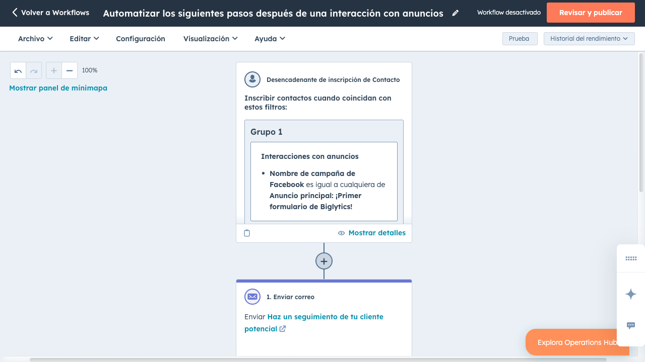 Mantén la conexión con tus clientes potenciales después de que interactúen con tus anuncios. Configura workflows automatizados basados en las interacciones de los leads con los anuncios para enviar mensajes de seguimiento relevantes e inscribirlos en una campaña de nutrición, de forma que la comunicación sea coherente en cada punto de contacto.