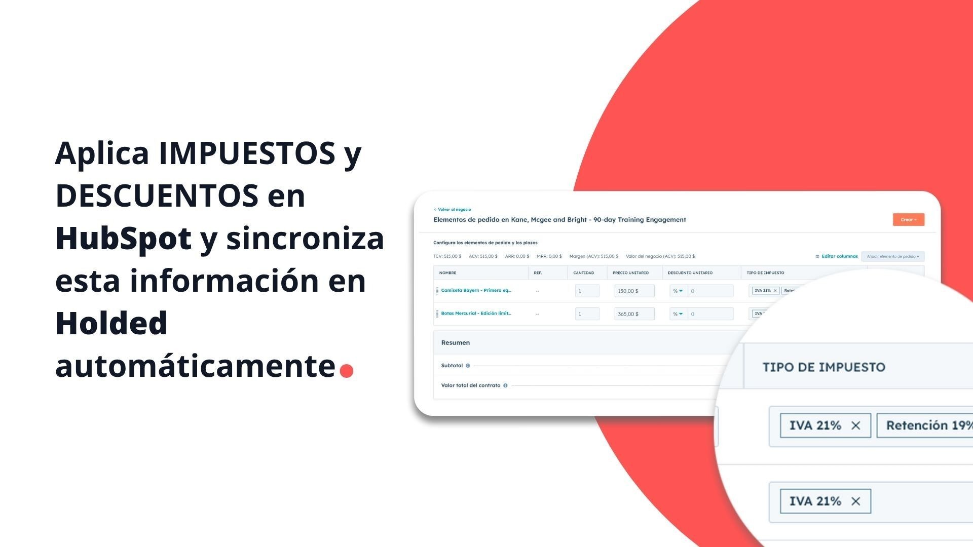 Configura fácilmente el tipo de impuesto y/o descuento que deseas aplicar en cada documento directamente desde HubSpot, y mantén esta información sincronizada automáticamente en Holded para una gestión bidireccional sin complicaciones.