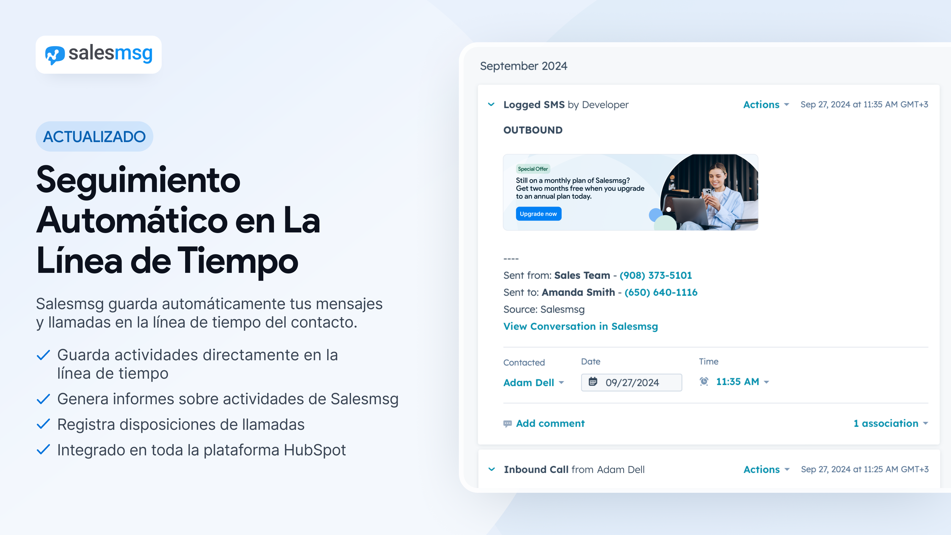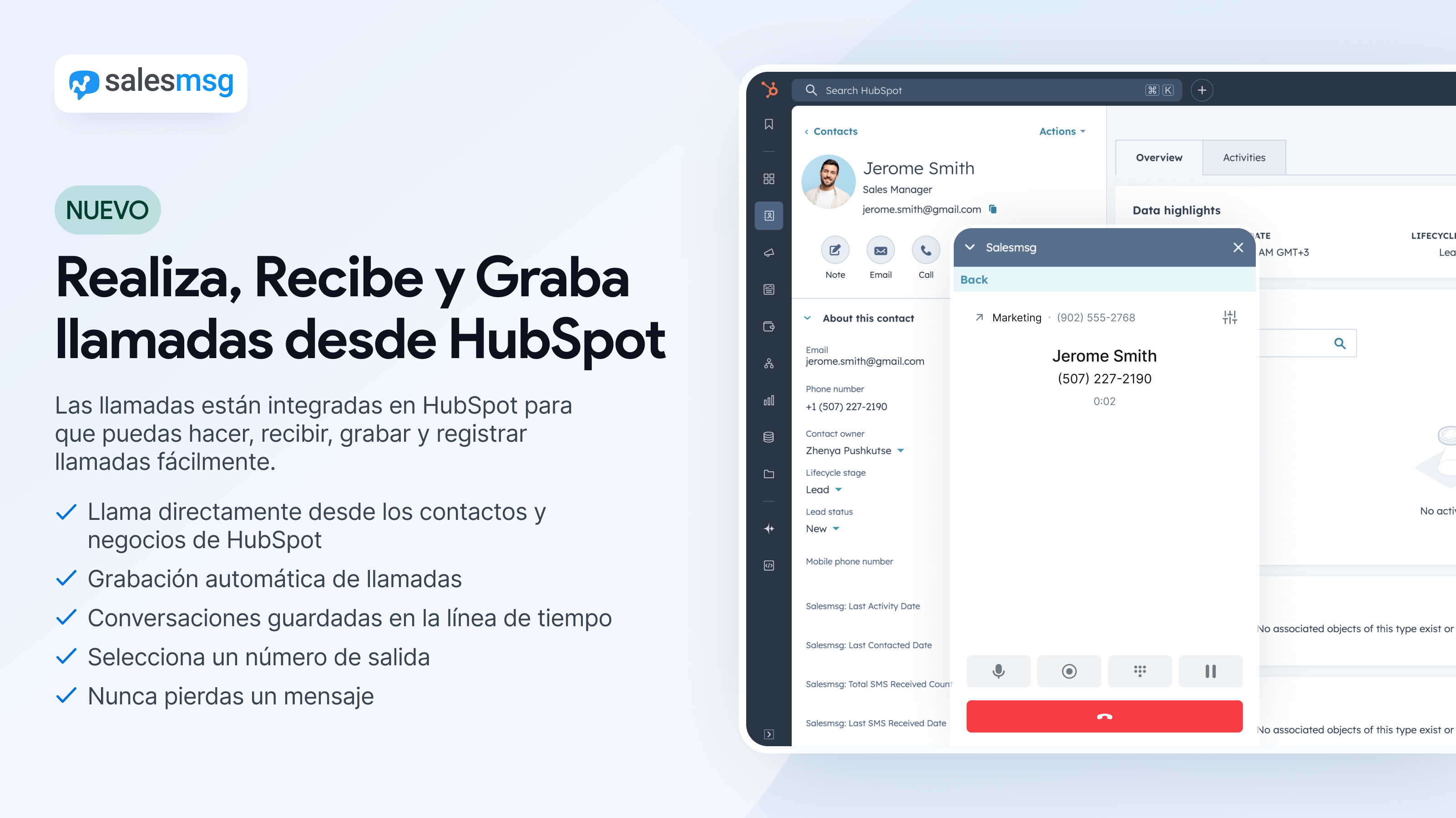 La plataforma de llamadas Salesmsg te permite llamar a tus contactos desde tu cuenta HubSpot y documentar todo en la línea de tiempo. Mensajes de texto y llamadas integradas en 1 plataforma.