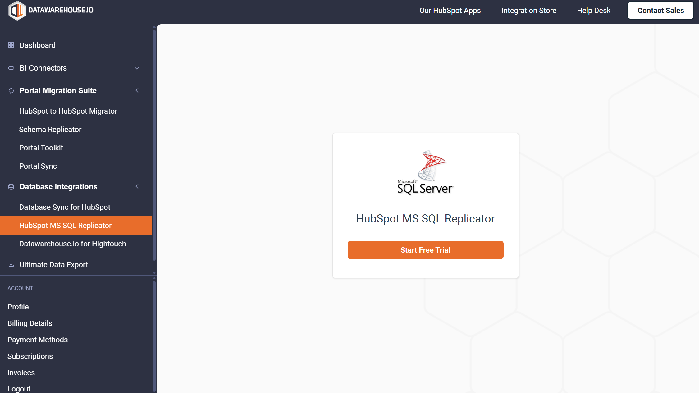 La aplicación MS SQL Server Integration proporciona a los usuarios un almacén de datos Azure MS SQL Server con un servicio ETL incorporado que extrae tus datos de HubSpot en la base de datos proporcionada. Puedes utilizarla como quieras. Construye una integración de middleware, construye una aplicación sobre ella, conéctala a herramientas de informes.
