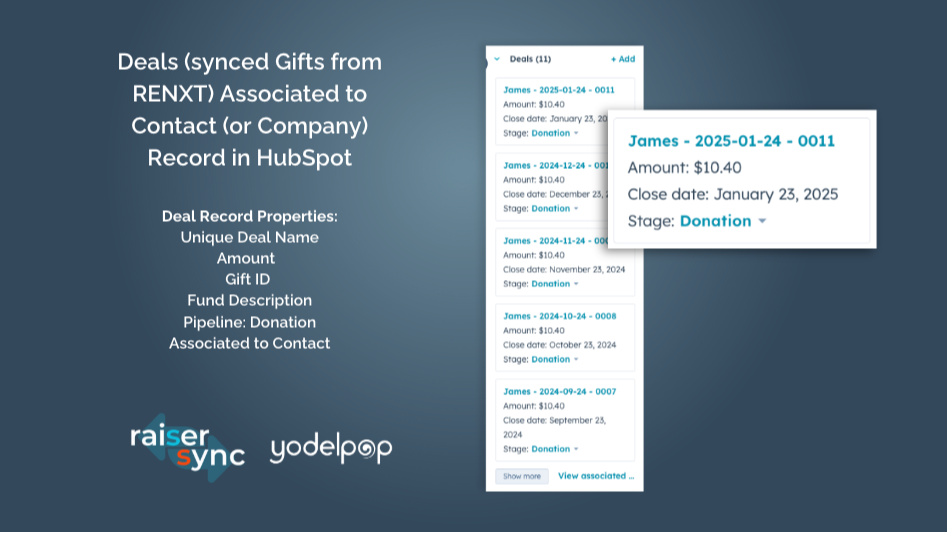 Automatically transform every RENXT gift into a HubSpot Deal with unique names, amounts, Gift IDs, and fund descriptions. Syncs same day (more frequent with Plus). Associates Deals to Contacts for personalized engagement or Companies for corporate donors. Set to Donation pipeline, enriching donor profiles with comprehensive donation histories.