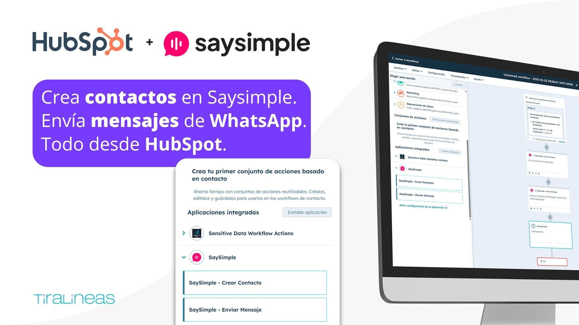 Envía mensajes de WhatsApp desde HubSpot y crea contactos en Saysimple directamente desde el CRM. Automatiza estas acciones a través de workflows.