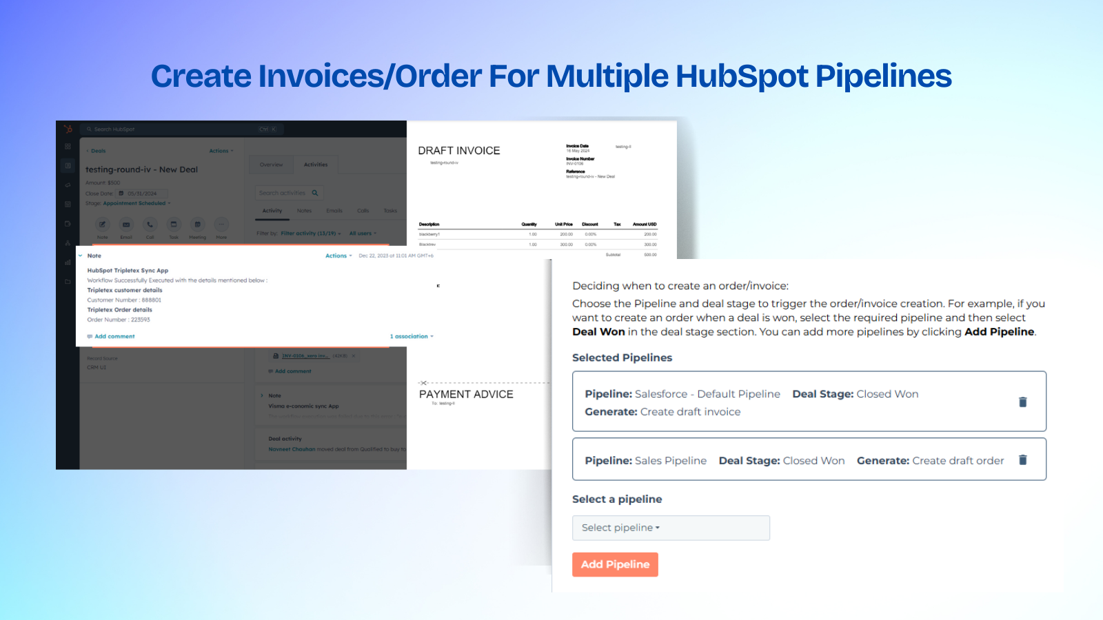 -Transform your billing process with instant HubSpot to Tripletex conversion. -Create invoices/orders automatically as deals progress, with flexible triggers for multiple pipelines. -Watch your documents sync automatically and check the integration status in your deals.