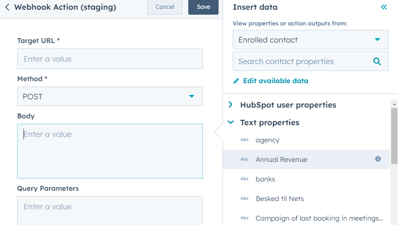 Build custom request bodies using HubSpot properties and static values. Tailor data sent to external systems, meeting specific API requirements. Include relevant HubSpot data, add custom fields, and structure your payload as needed for accurate and efficient data transfer.
