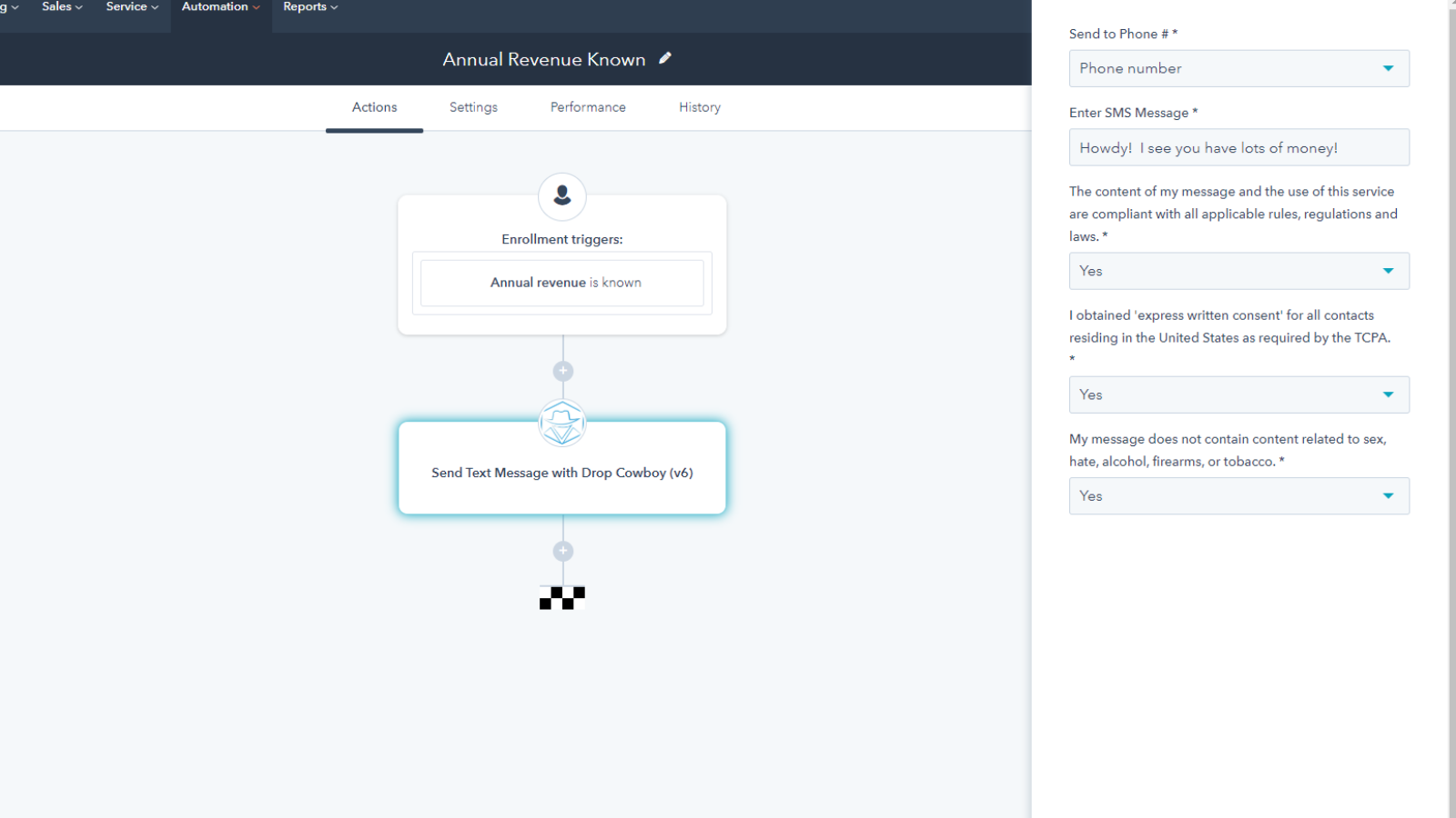 Automate your marketing by sending text or voicemail messages to your contacts using the HubSpot Workflows engine. You can set up flow charts to tailor specific messages to automatically send to clients based upon certain actions or events using the powerful Workflows tool at HubSpot.