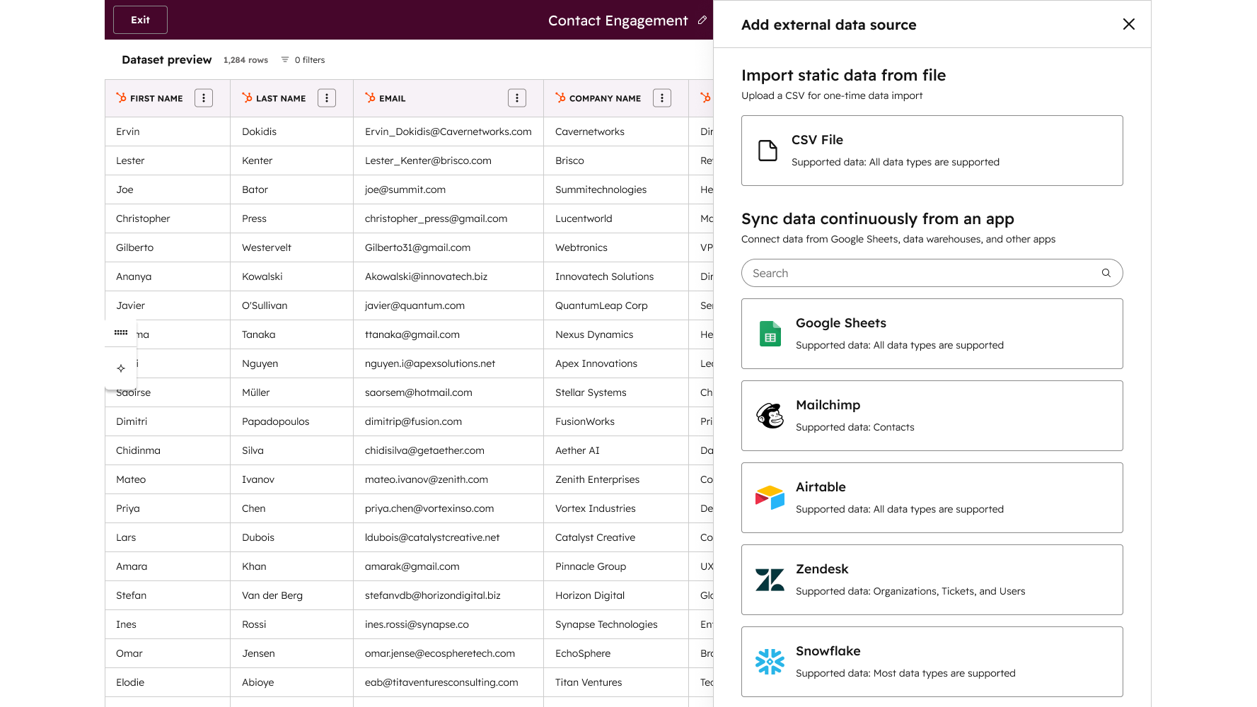 Use data studio in Data Hub to create custom datasets that power advanced segmentation, automation, and reporting. Combine customer data from your entire tech stack and manage the flow of data between Google Sheets and the HubSpot CRM.