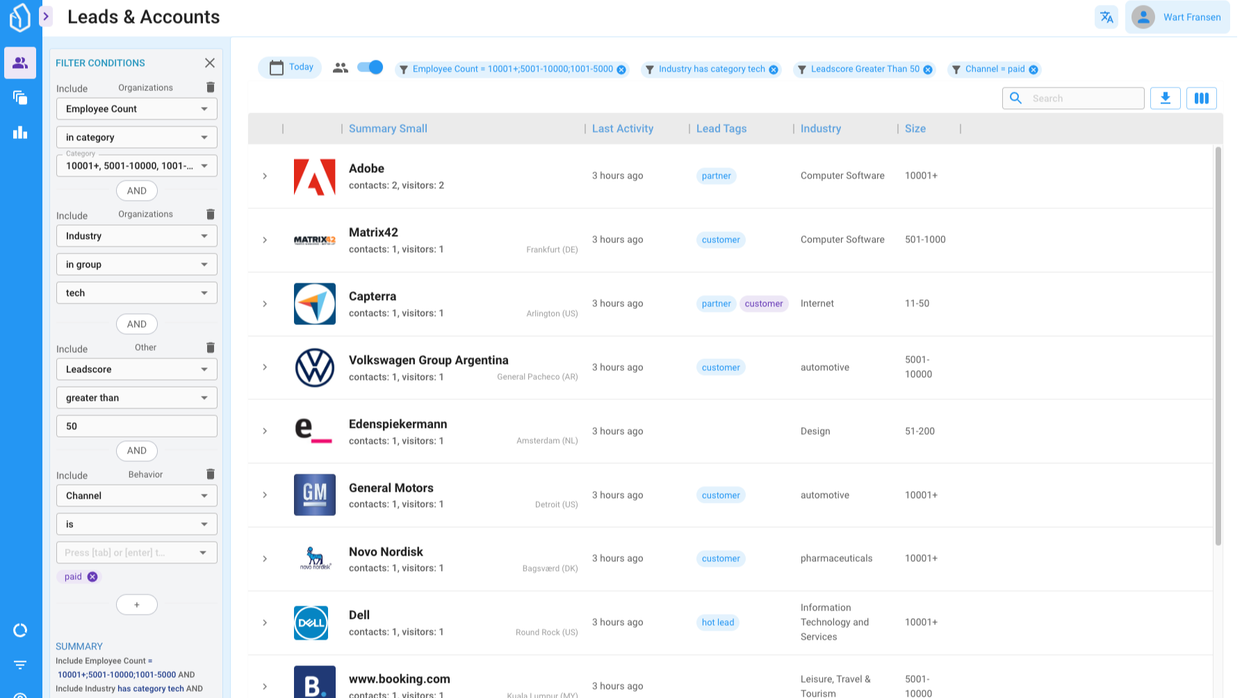 Our platform is designed to work with many different sources of data, has built-in features to enrich company (or personal) data, allows you to qualify prospects based on behaviour and profile data, and includes powerful filters and intuitive scoring algorithms to create segments.