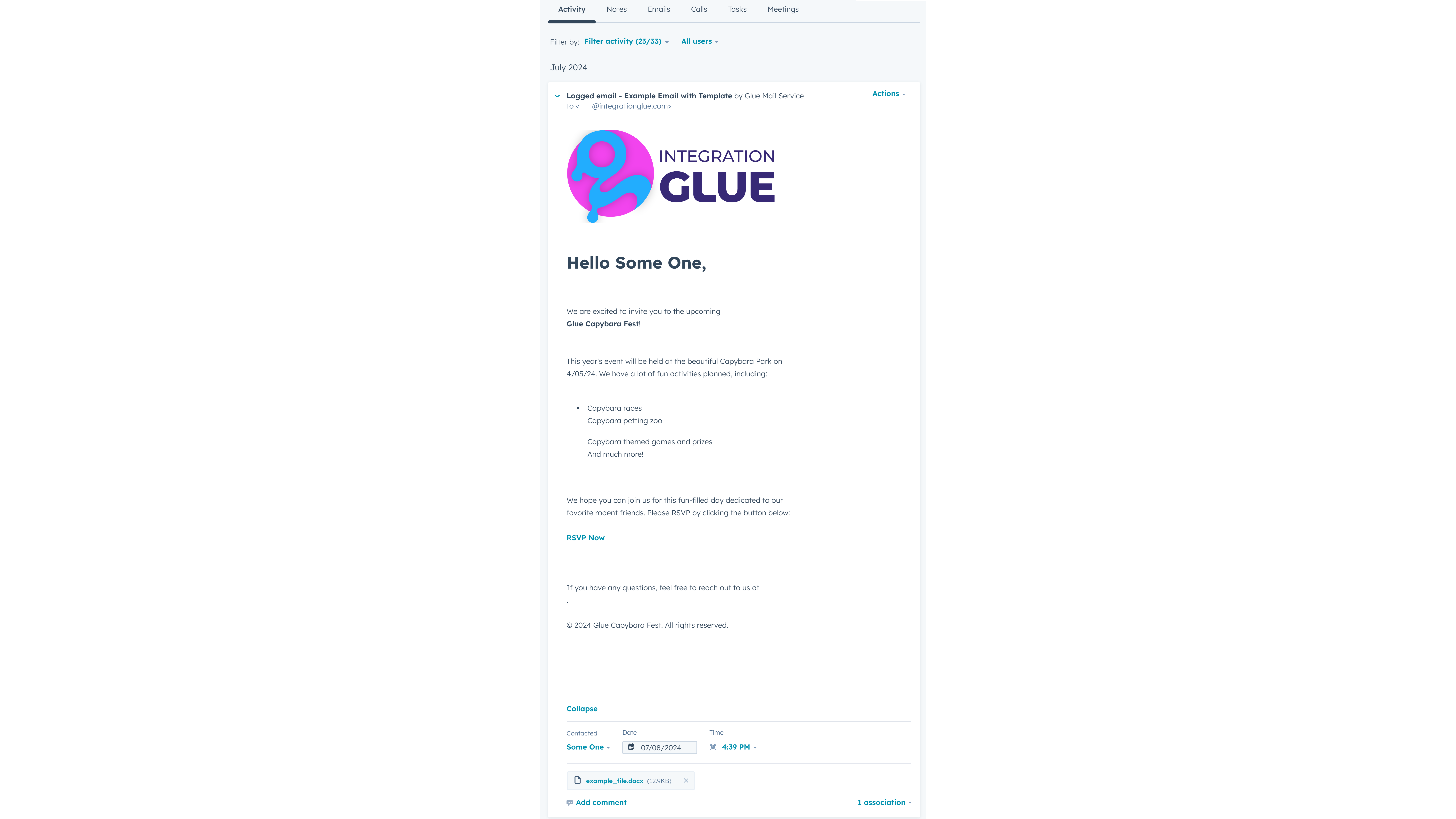 Log emails sent as an email Engagement against CRM record timelines. Associate the Mailgun email with the enrolled record or other associated object records. Or utilize data from enrolled and associated records to specify record IDs for email association, ensuring comprehensive email tracking and visibility.