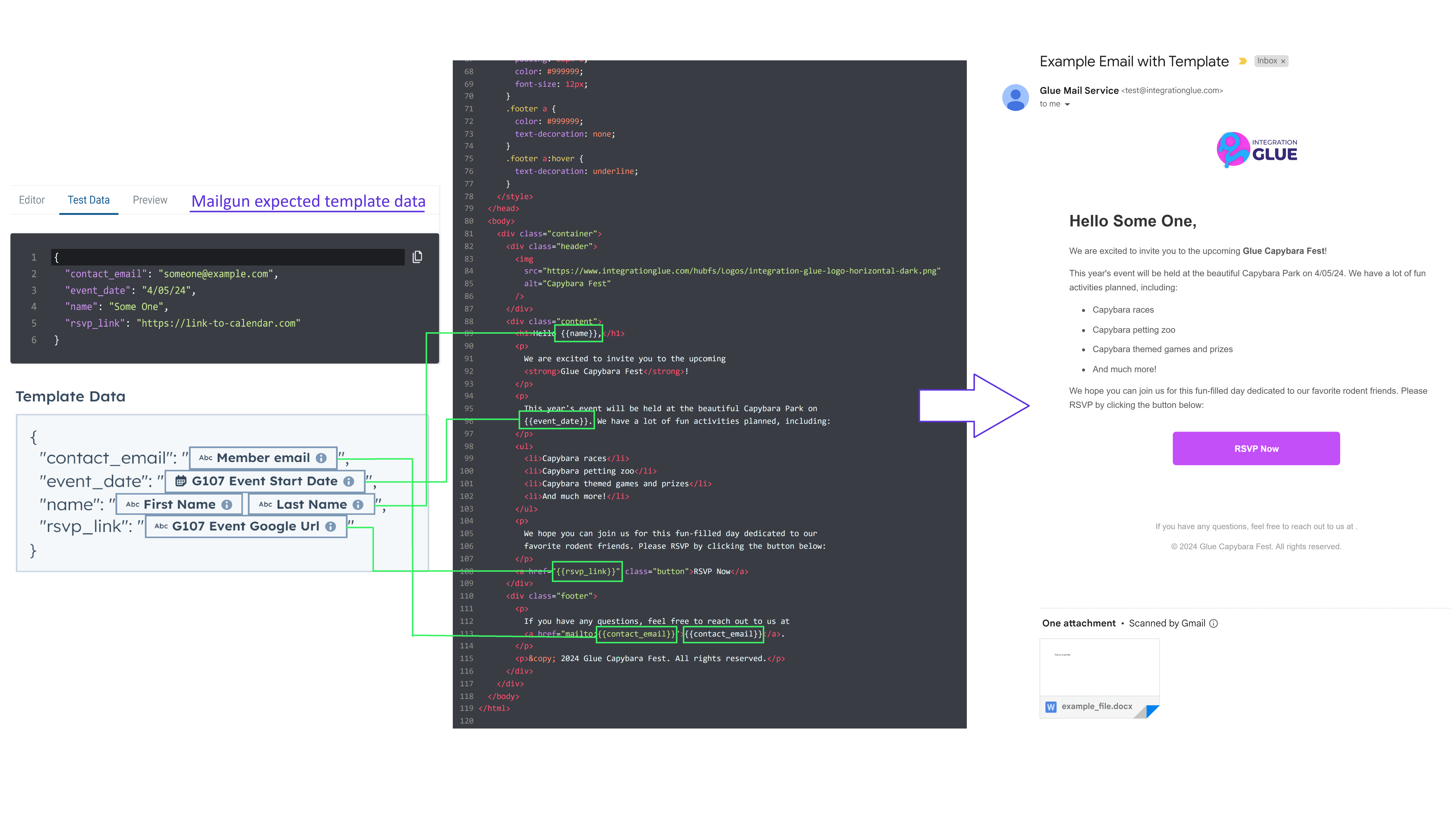 Use Mailgun Templates or overwrite template content directly from HubSpot Workflows. Select templates from your Mailgun account and add code to replace template data with information from enrolled and associated records. This feature allows rich, personalized transactional email content and designs.