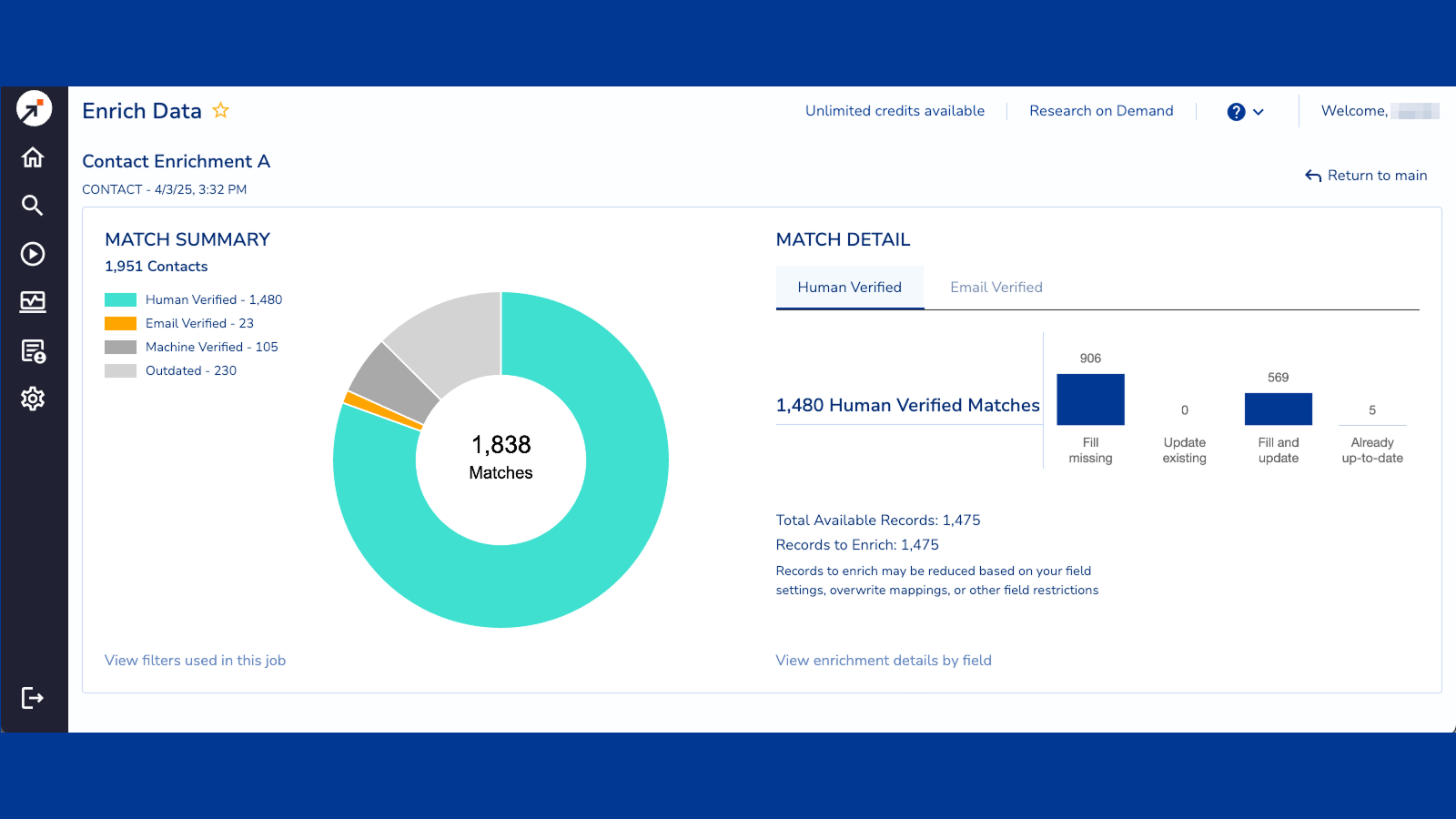 Understand the impact of your enrichment job by viewing overall match reporting, plus field level detail.
