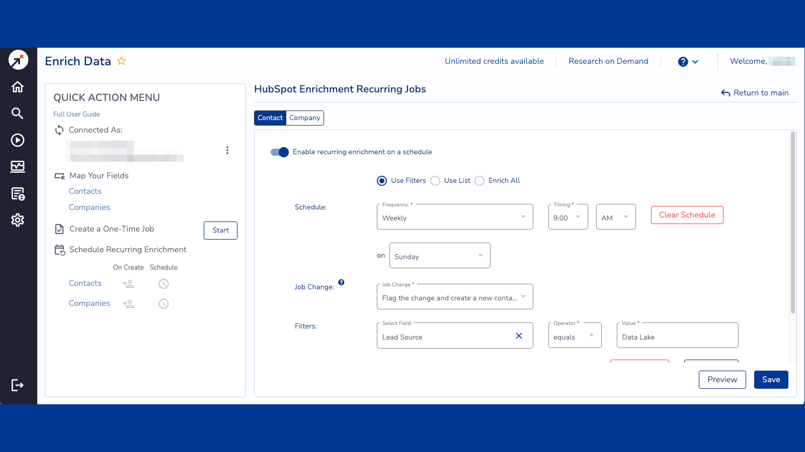 Choose how to run your jobs. You can choose to enrich contacts or companies or both. You can also run a one-time job; schedule recurring jobs; and/or enrich new records when they are created. Finally, you can filter records using HubSpot property values or existing HubSpot dynamic or static lists. You can also enrich all records.