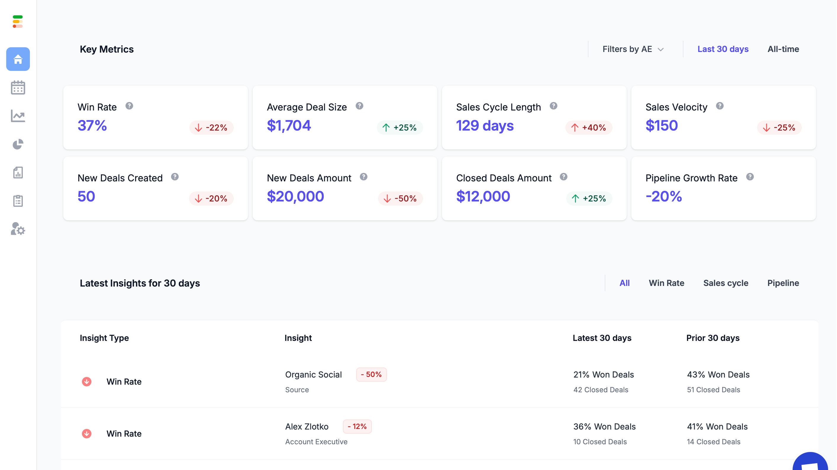 - Receiving real-time sales performance insights that not only highlight problems but also provide actionable recommendations to increase win rates, shorten the sales cycle, and improve overall performance.