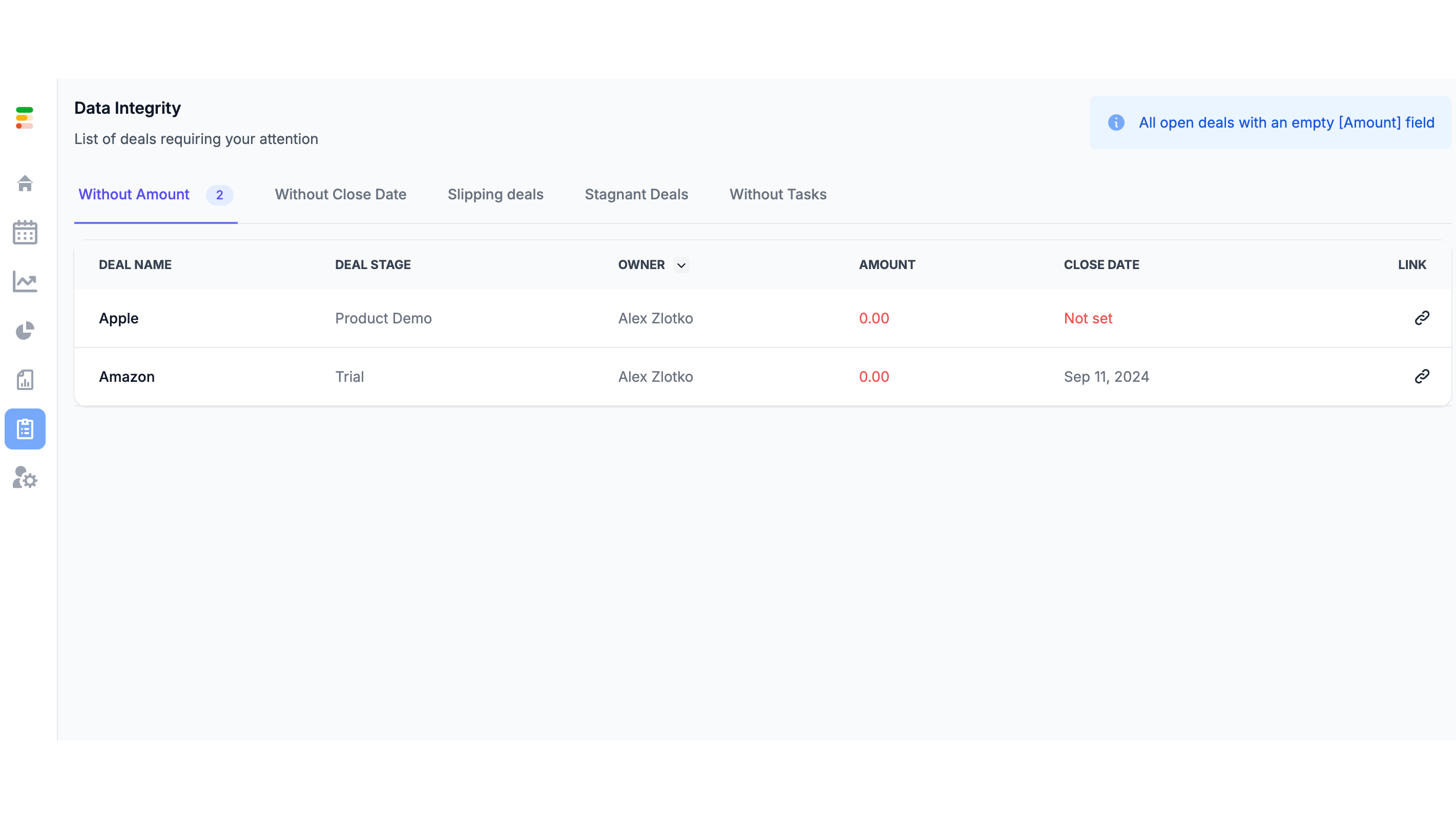 Forecastio helps quickly assess pipeline data and identify missing information, such as deal amount or close date. Sales leaders can easily spot risky deals, including those that are constantly slipping, stuck in the pipeline for too long, or lacking planned activities. This increases the effectiveness of weekly one-on-one meetings with sales reps.