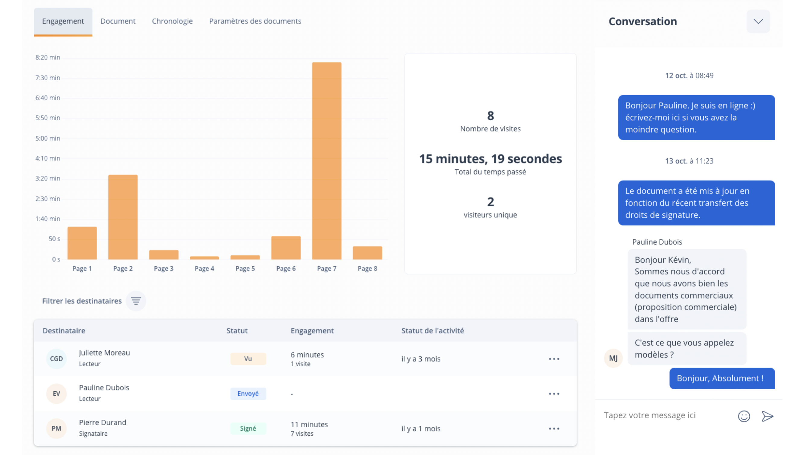 Suivez la façon dont vos prospects interagissent avec vos propositions ou le contenu de votre Digital Sales Room en temps réel et prenez les bonnes décisions. Vous savez également combien de fois un document a été ouvert, quelles pages ont été les plus consultées et avez accès à l'historique du chat et des connexions.