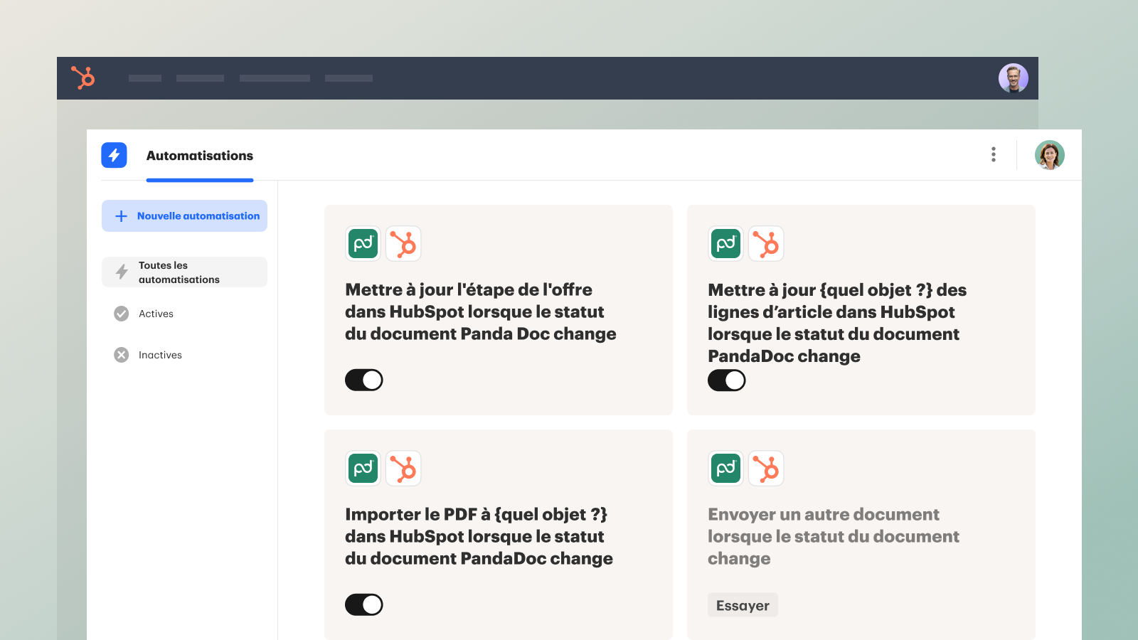 Gagnez du temps et raccourcissez les délais de clôture en automatisant le processus de création de documents, en suivant les statuts dans HubSpot, en définissant l'ordre des approbations et en accédant à des analyses en temps réel. Grâce à la synchronisation bidirectionnelle, vous n'avez plus besoin de copier manuellement les données.