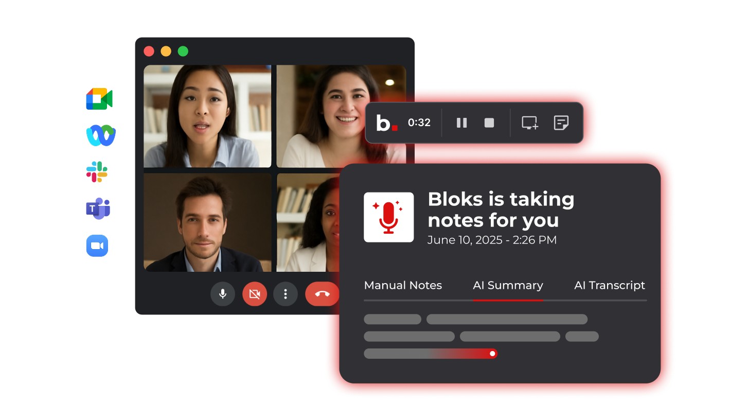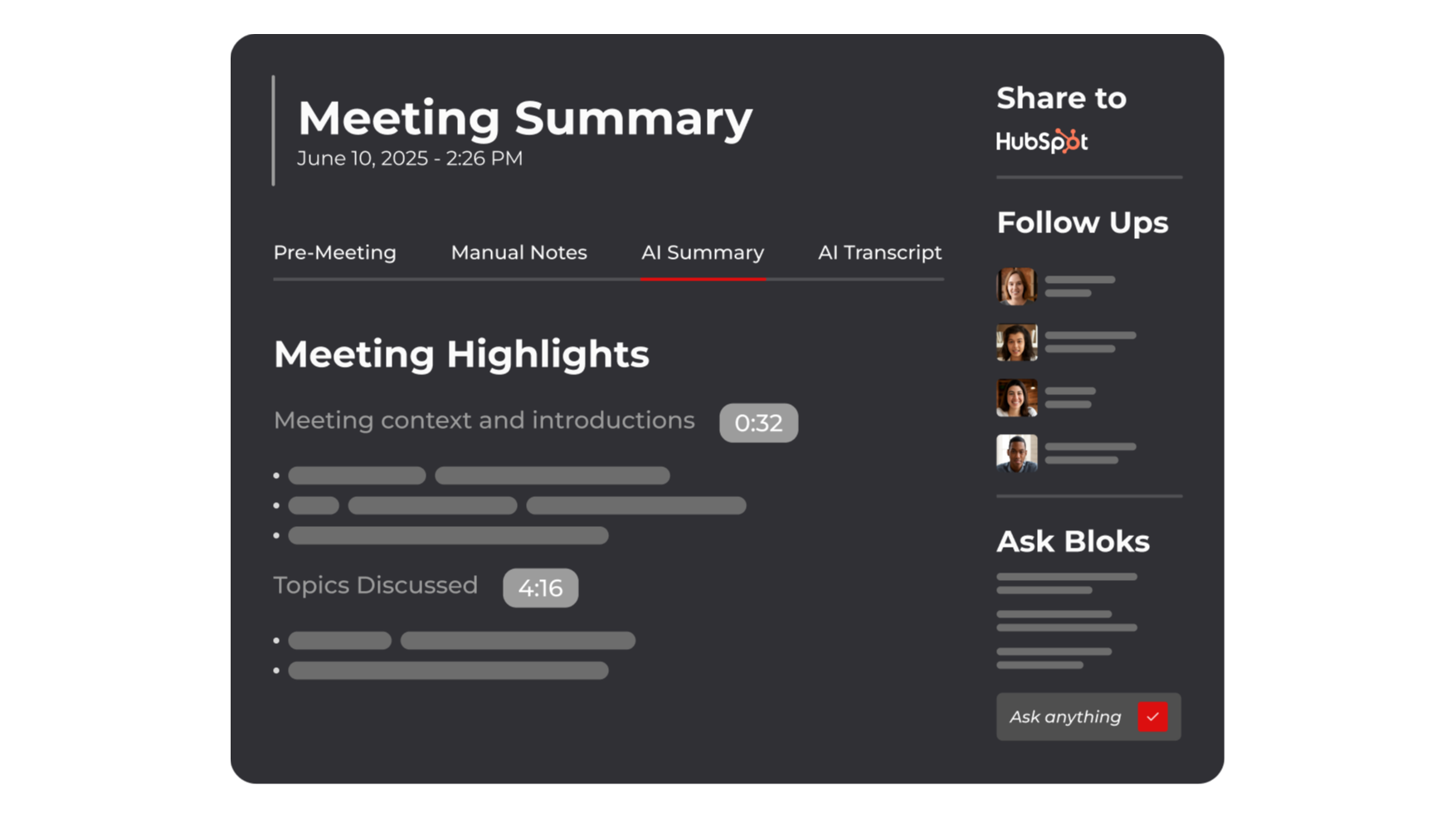 Capture meetings your way–Zoom, Teams, Meet or in-person–with zero bots and zero friction. Bloks is always in your control. Your notes, screenshots, and important highlights merge automatically into sharp, accurate summaries that flow straight into HubSpot.