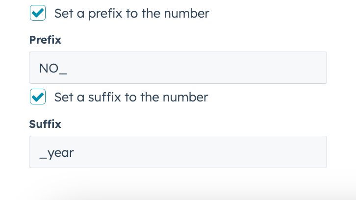 If you want the number to have a pre- or suffix, you can just enter the desired text or numbers. If you enter "NO_ " as a prefix and "_year" as a suffix, your first returned number will be NO_000001_year